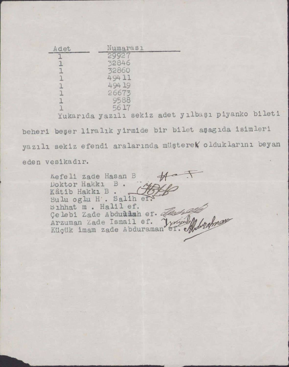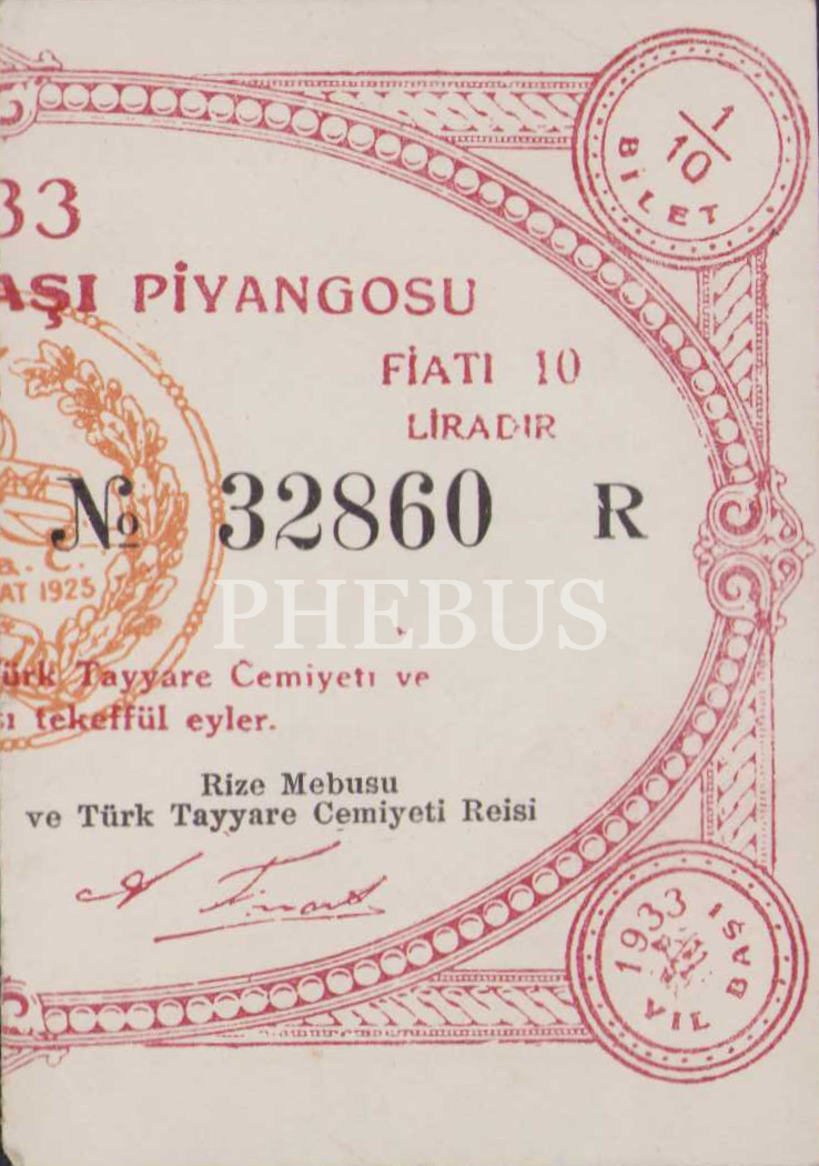 Türk Tayyare Cemiyeti Yılbaşı Piyangosu 1/10 bileti ile bir çekiliş sonucu vesikası, 1933 tarihli, yarım bilet, 6,5x9cm