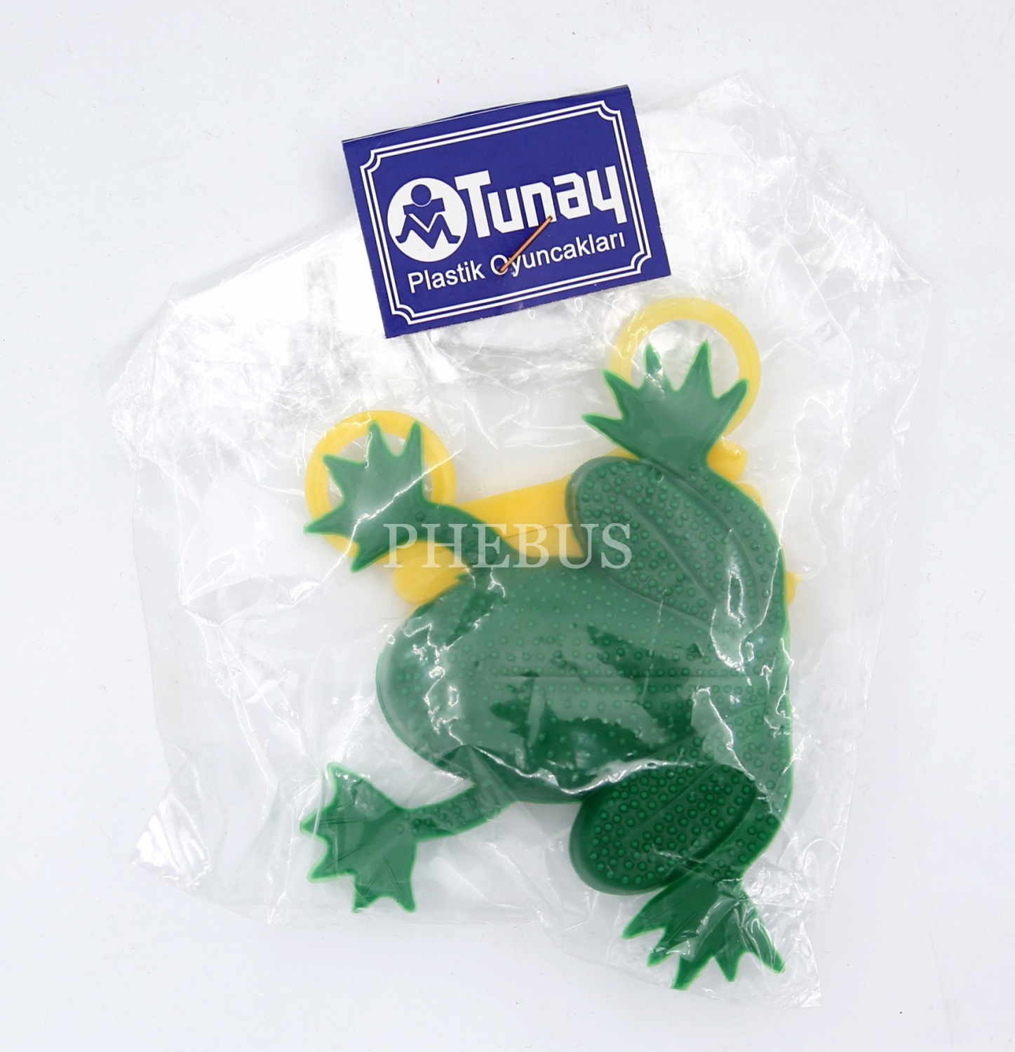 Türk malı, Tunay Plastik Oyuncakları, ambalajında fırlatma mekanizmalı, plastik oyuncak kurbağa, 9x12 cm