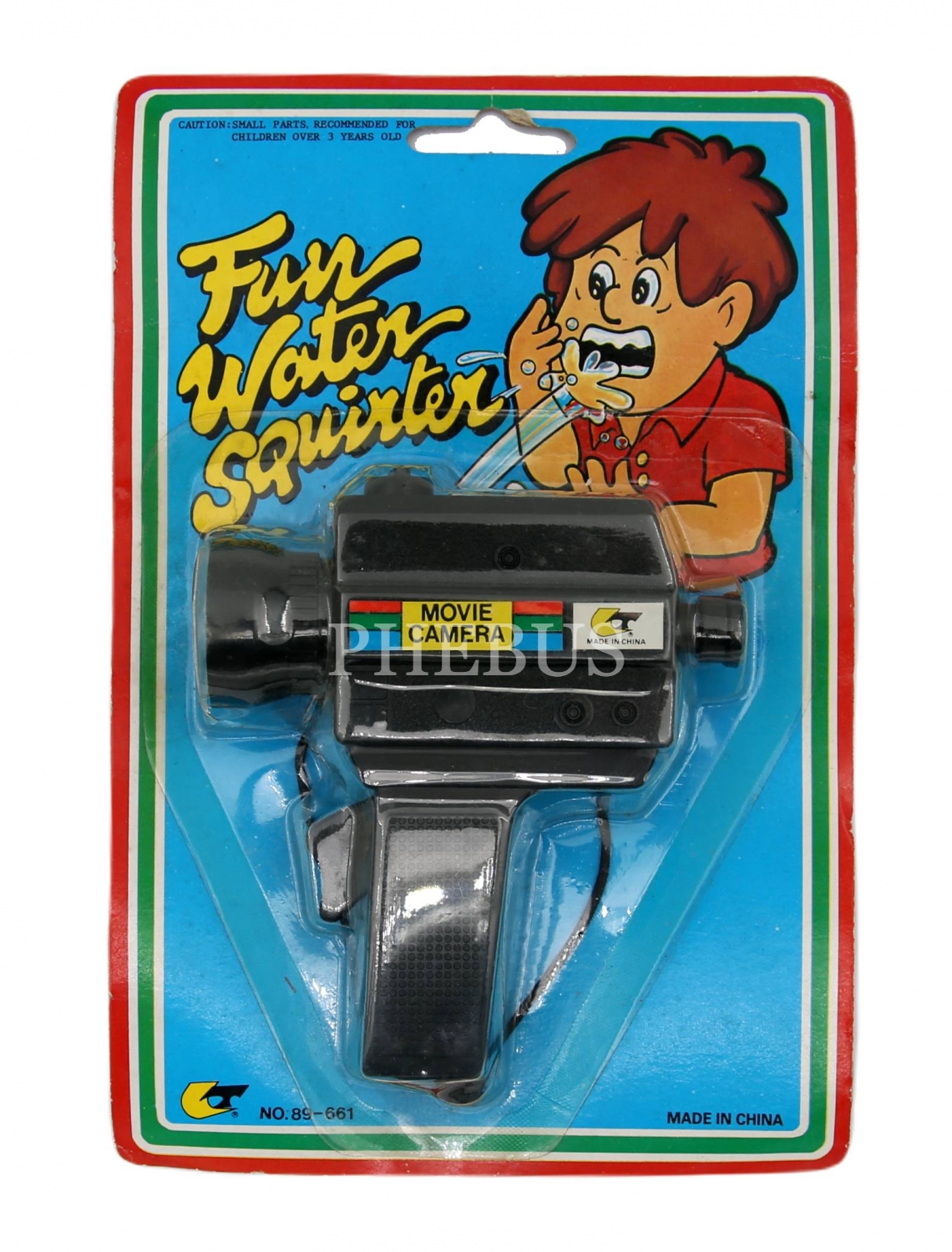 Ambalajında, kamera formunda plastik oyuncak su tabancası, 9x10 cm