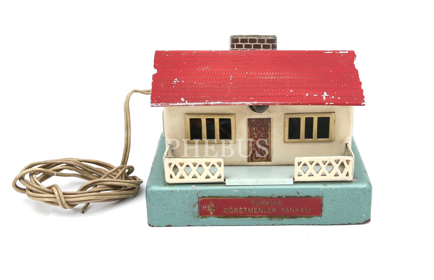 Türkiye Öğretmenler Bankası, ev formunda, metal kumbara, haliyle 16x11x12 cm