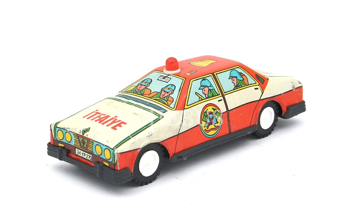 Türk malı, Gürel, kutusunda, kırmızı tepe lambalı , teneke tfaiye arabası, 7x18x6 cm