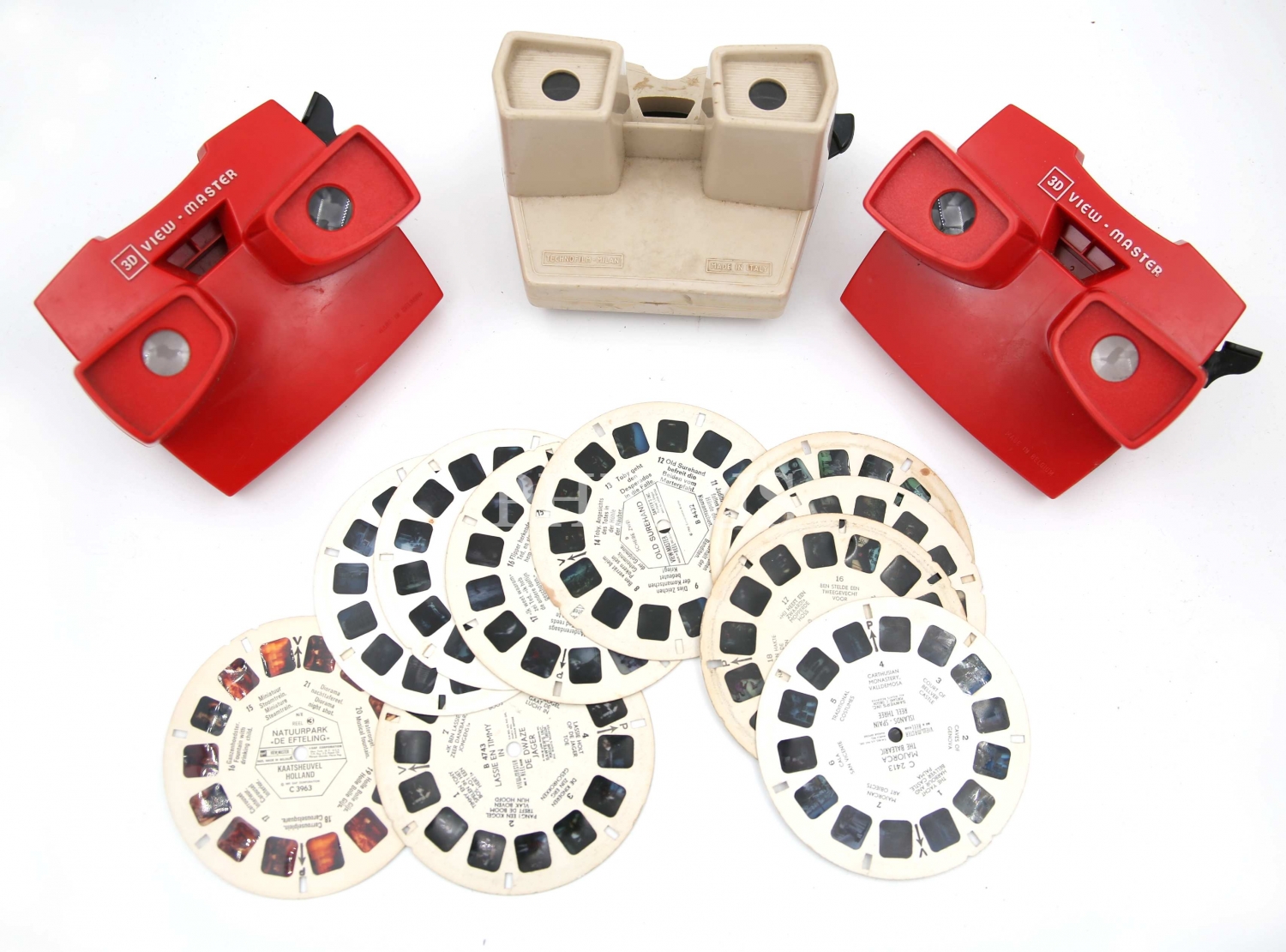 Biri İtalya, ikisi Belçika malı, 3 adet Stereo-rama, 11 adet view-master filmiyle beraber, 10x11x8 cm