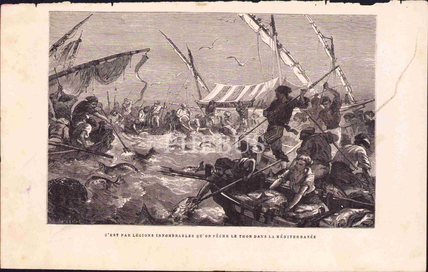 Gravür, Akdeniz ton balığı avı, dergiden kesilmiş, 21x13 cm