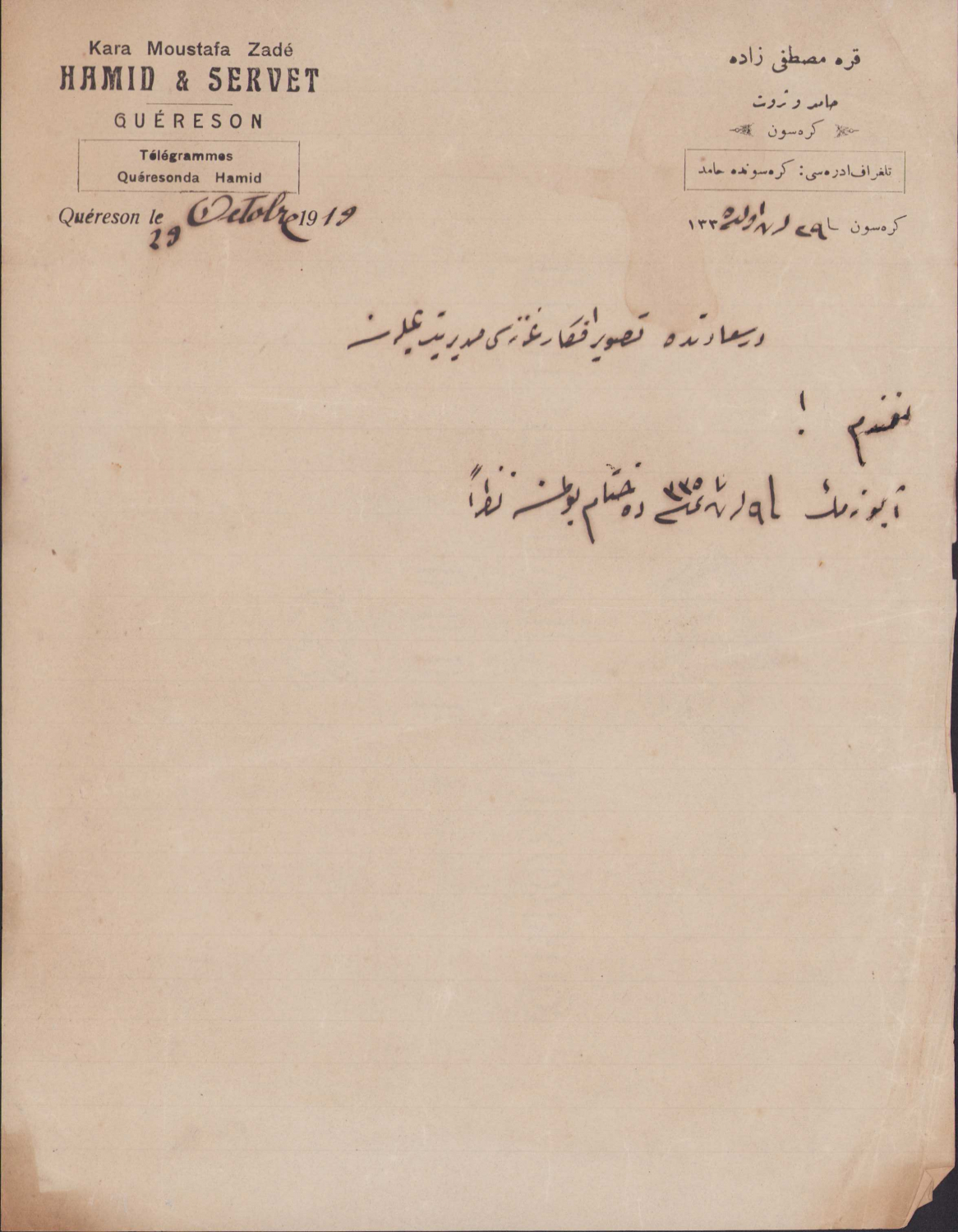 Kara Mustafazade Hamit & Servet Küreson antetli, Osmanlıca - Fransızca yazılı, Dersaadette Tasvir-i Efkar Gazetesi Müdiryeti'ne yazılmış yazı, 1335 tarihli, 20x26cm