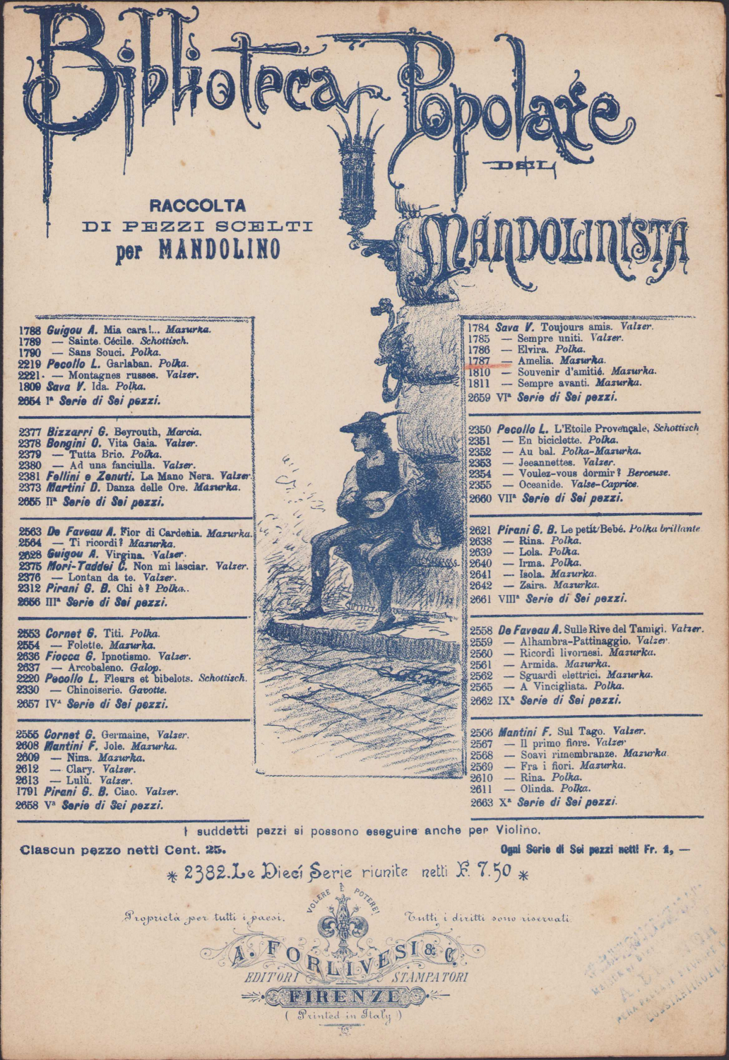 İtalya Popüler Mandolinist Kütüphanesi baskısı müzik notası, 2 yaprak, İtalyanca yazılı, 20x28cm