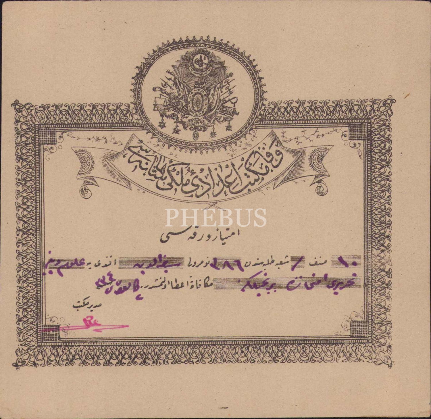 Osmanlıca imtiyaz varakası, Vefa Mektebi İdadi Mülkiye-i Şahane, 1234, 15x14 cm