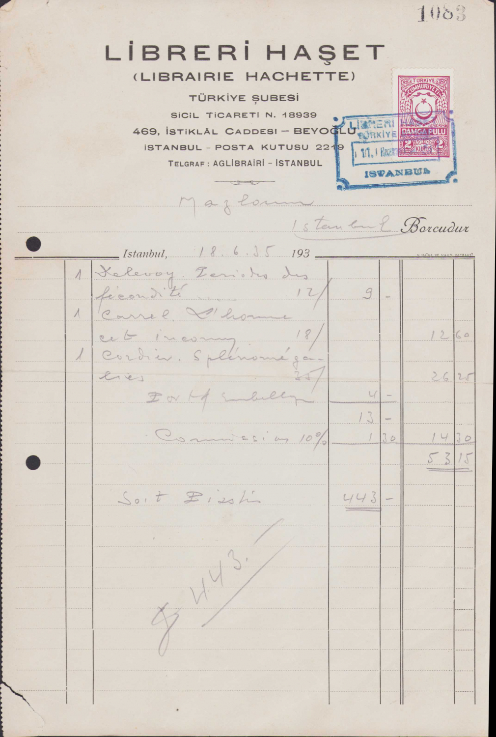 Libreri Haşet (Haşet Kitapevi) Türkiye Şubesi antetli fatura, İstiklal Caddesi adresli, İstanbul, 1935 tarihli, pullu, kaşeli, 18x27cm