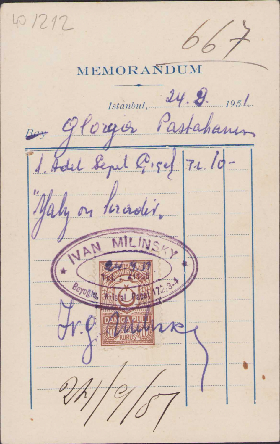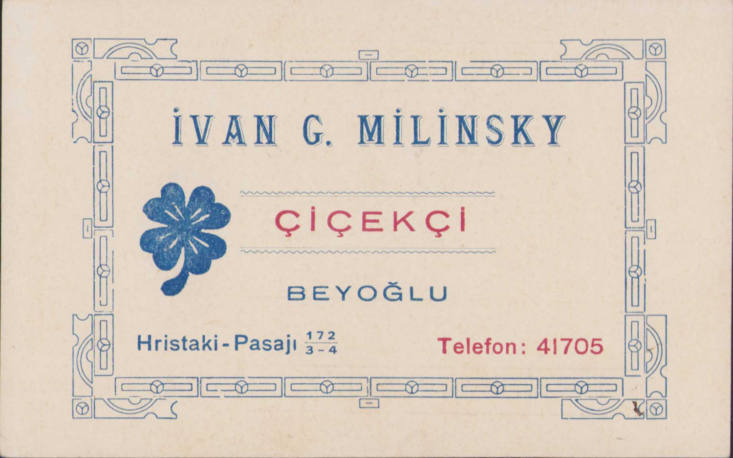 İvan G. Milinsky Çiçekçisi işyeri kartı, Hristaki-Pasajı Beyoğlu adresli, 1951 tarihli, pullu, damgalı, 10x15,5cm