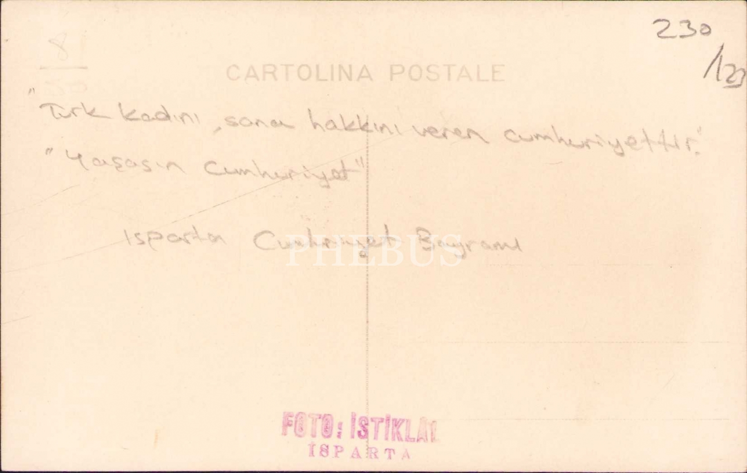 Isparta Cumhuriyet Bayramı: "Türk kadını, sona hakkını veren cumhuriyettir", "Yaşasın Cumhuriyet", Foto İstiklal, Isparta damgalı