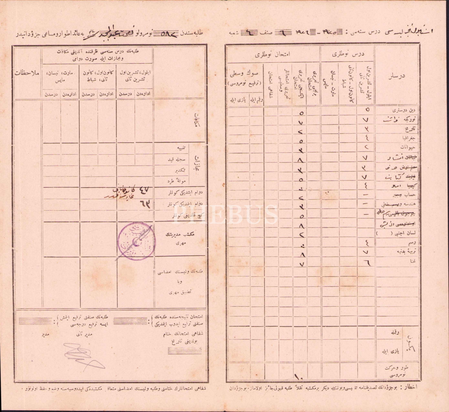 Osmanlıca İstanbul Kız Lisesi, 1926 tarihli karne, 12x20 cm