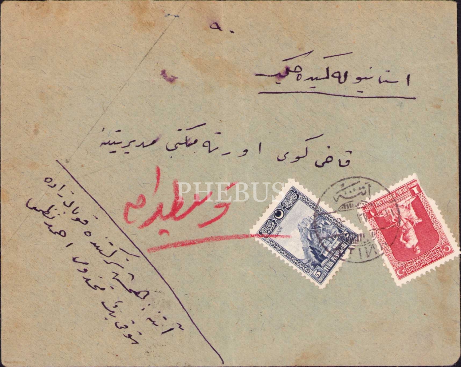Osmanlıca mektup zarfı, Atina'dan İstanbul Kadıköy Orta mektebi müdüriyetine gönderilmiş, Atina damgalı, postadan geçmiş zarf