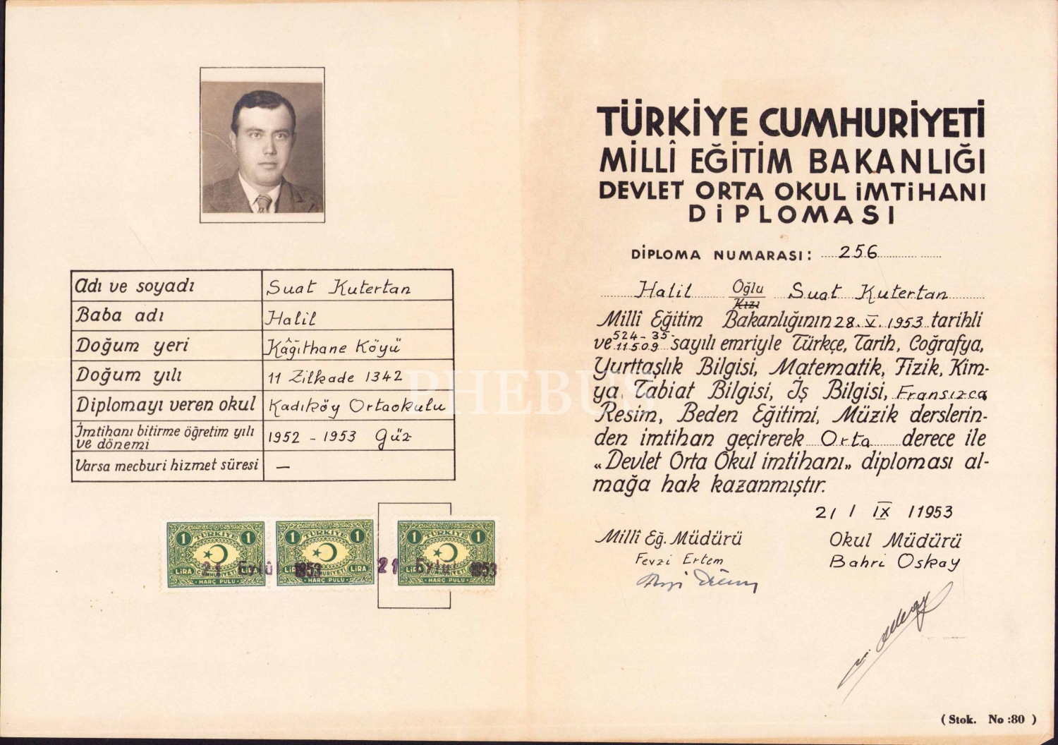 T.C. Milli Eğitim Bakanlığı Devlet Orta Okul İmtihan Diploması, 1953, 30x20 cm