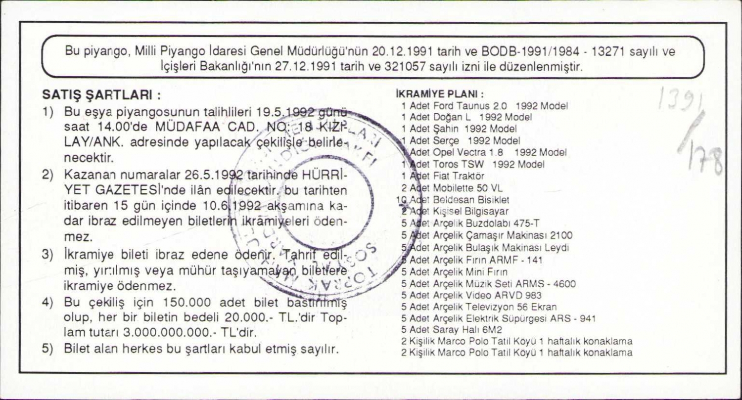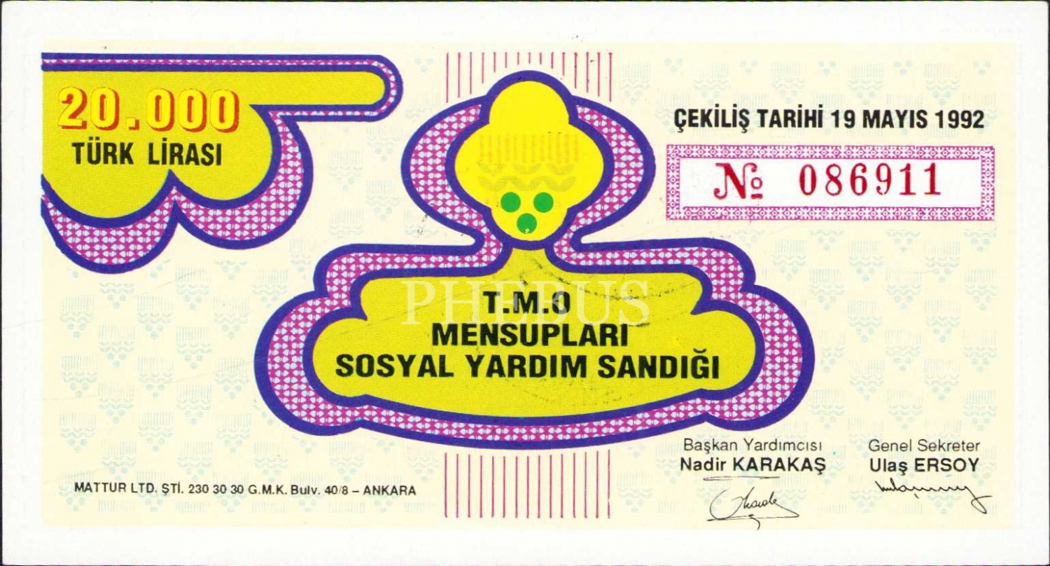 T.M.O Mensupları Sosyal Yardım Sandığı Eşya Piyango bileti, 1991 tarihli, 12x6 cm,