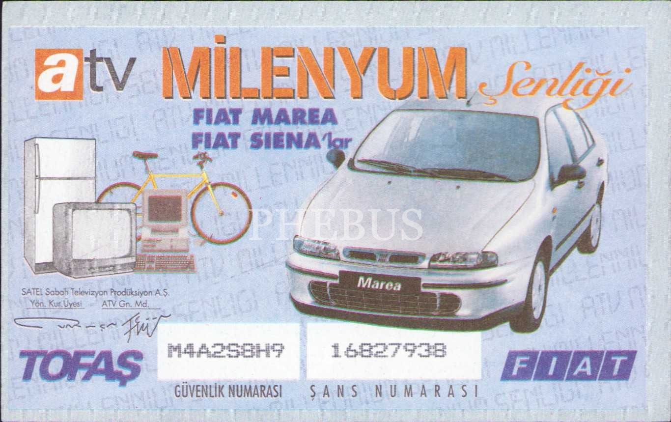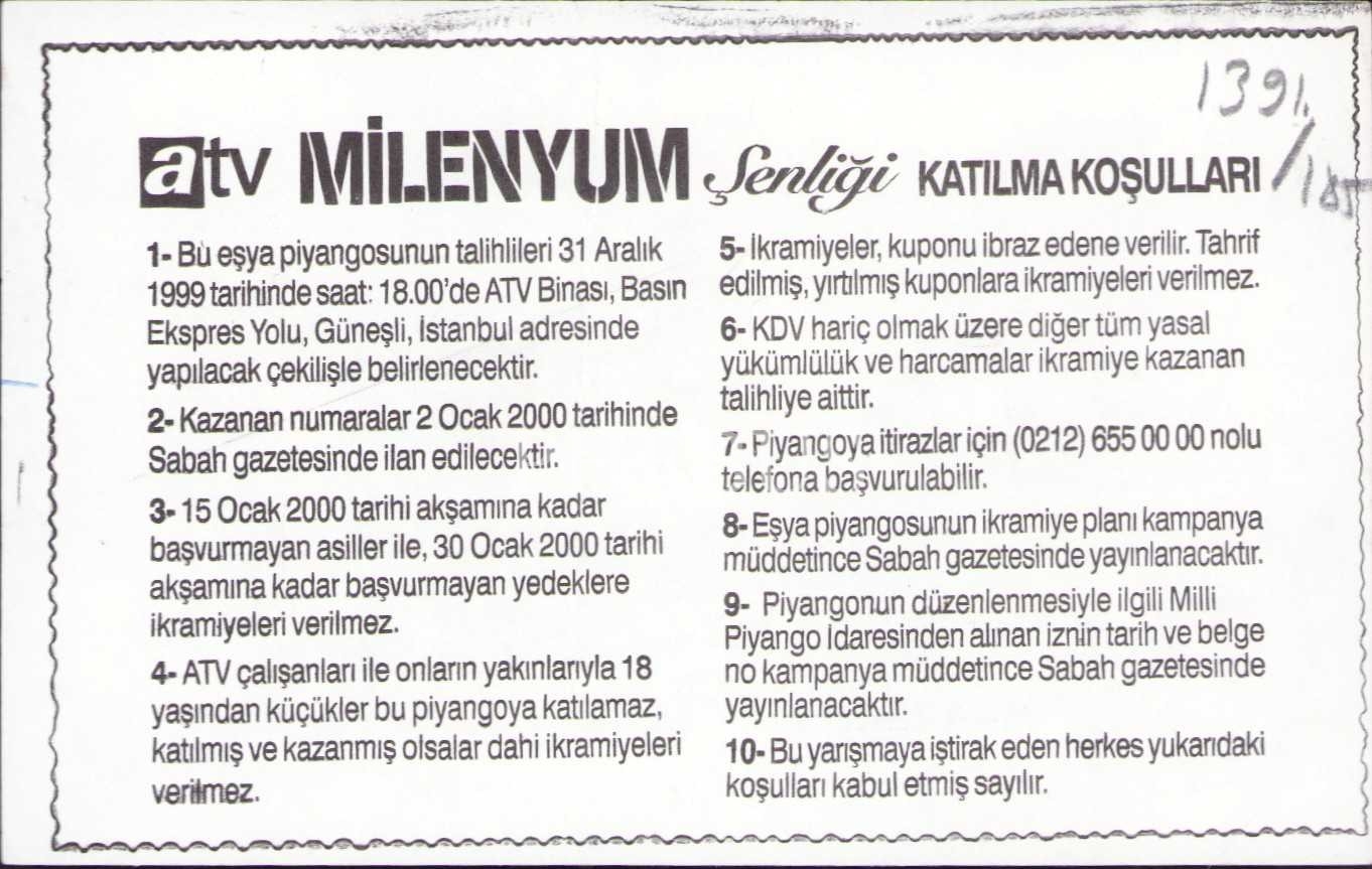 ATV Milenyum Şenliği Eşya Piyango bileti, 2000, 10x6 cm
