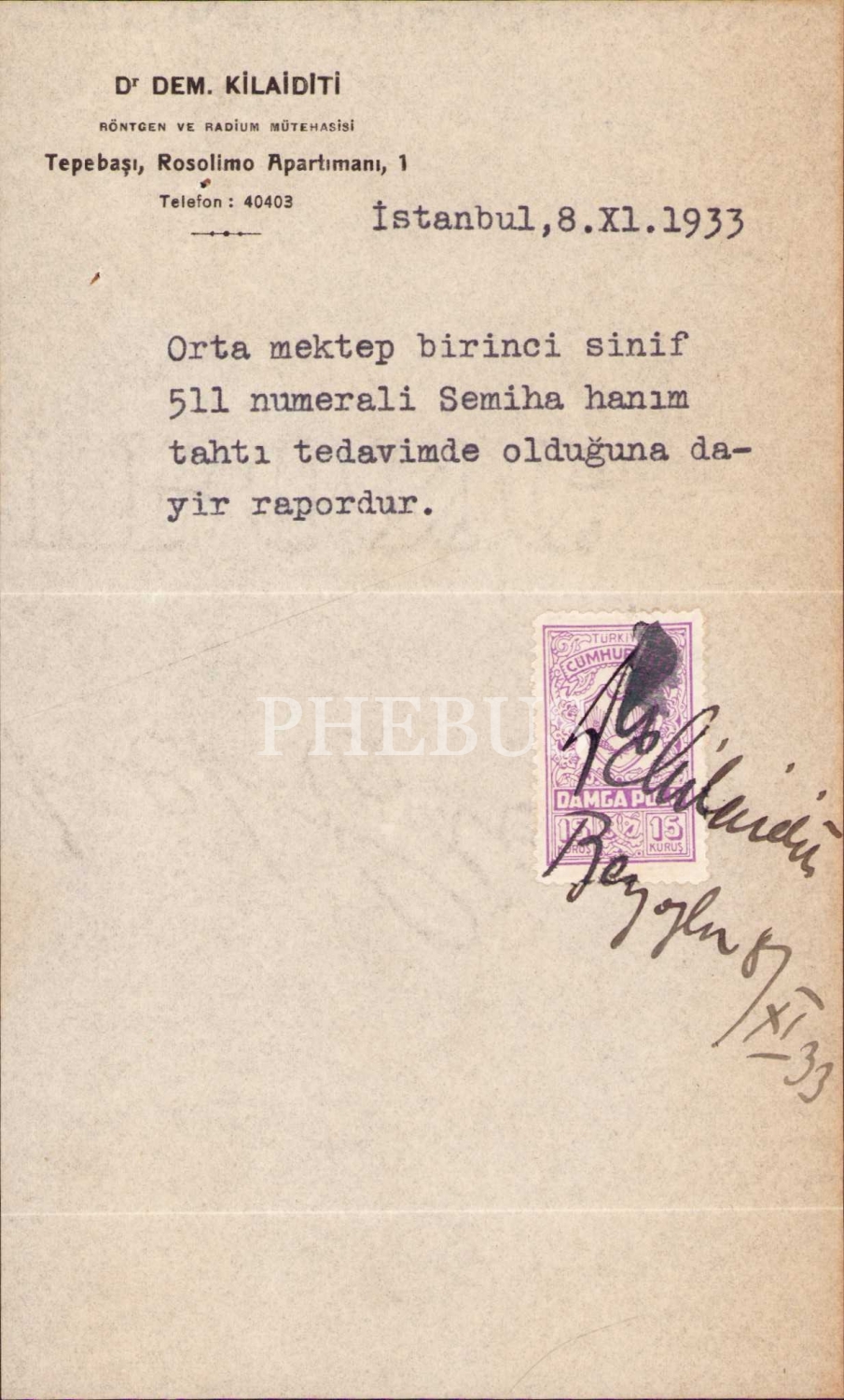 Dr. Dem. Kilaiditi antetli, 1933 tarihli reçete, 10x16 cm