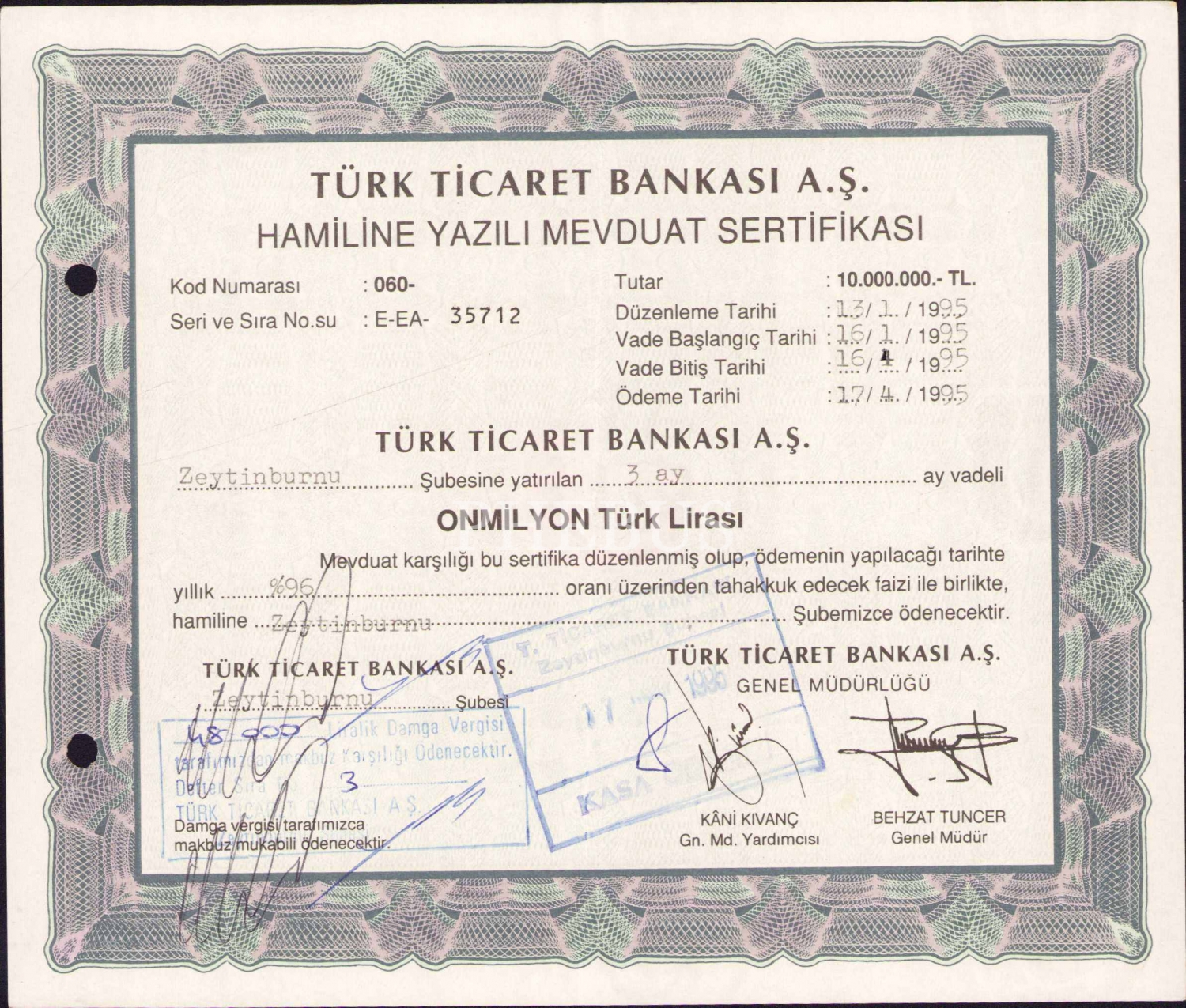 Türk Ticaret Bankası A.Ş. Hamiline Yazılı Mevduat Sertifikası, 1995 tarihli, 19x16 cm