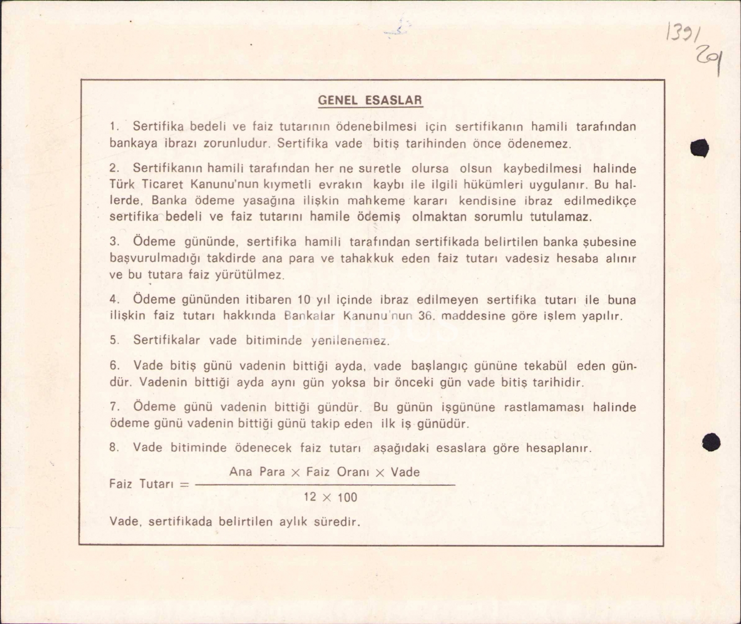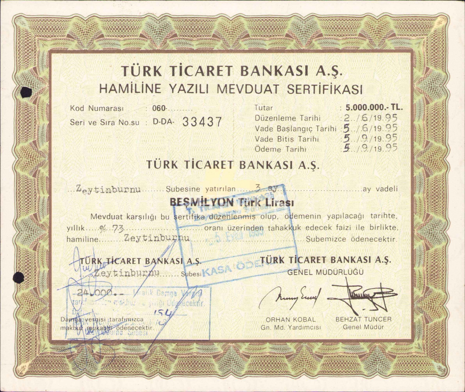 Türk Ticaret Bankası A.Ş. Hamiline Yazılı Mevduat Sertifikası, 1995 tarihli, 19x16 cm