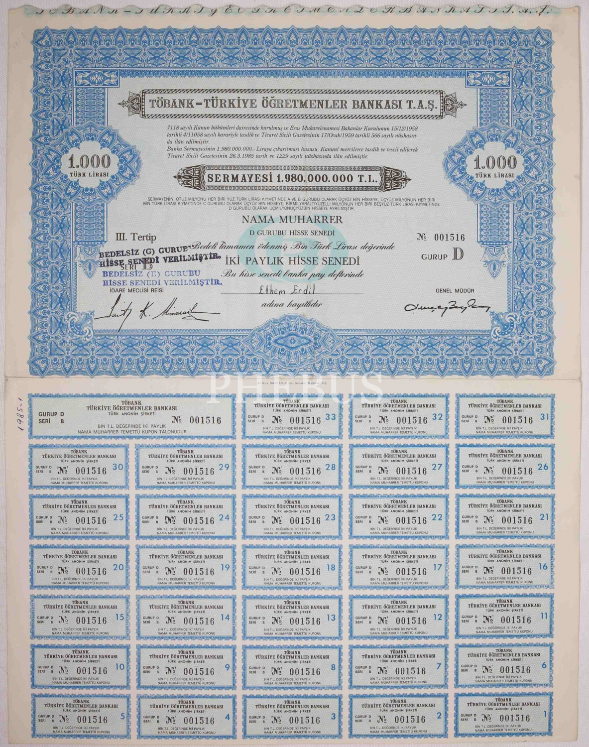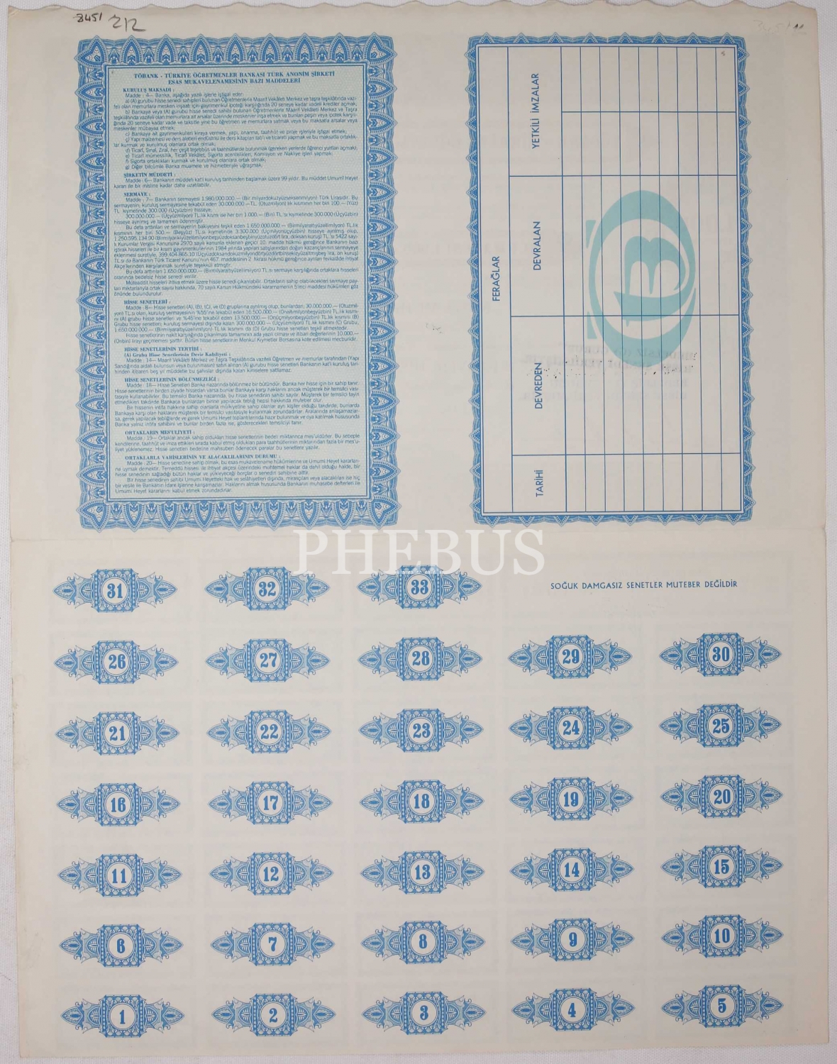 Töbank - Türkiye Öğretmenler Bankası T.A.Ş. hisse senedi, 32x42 cm