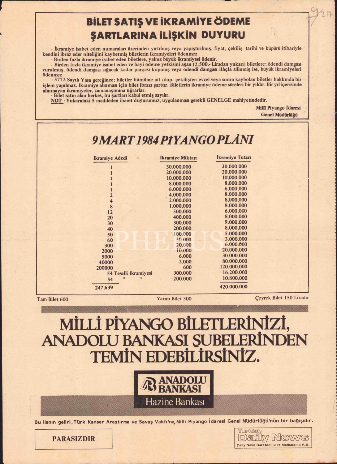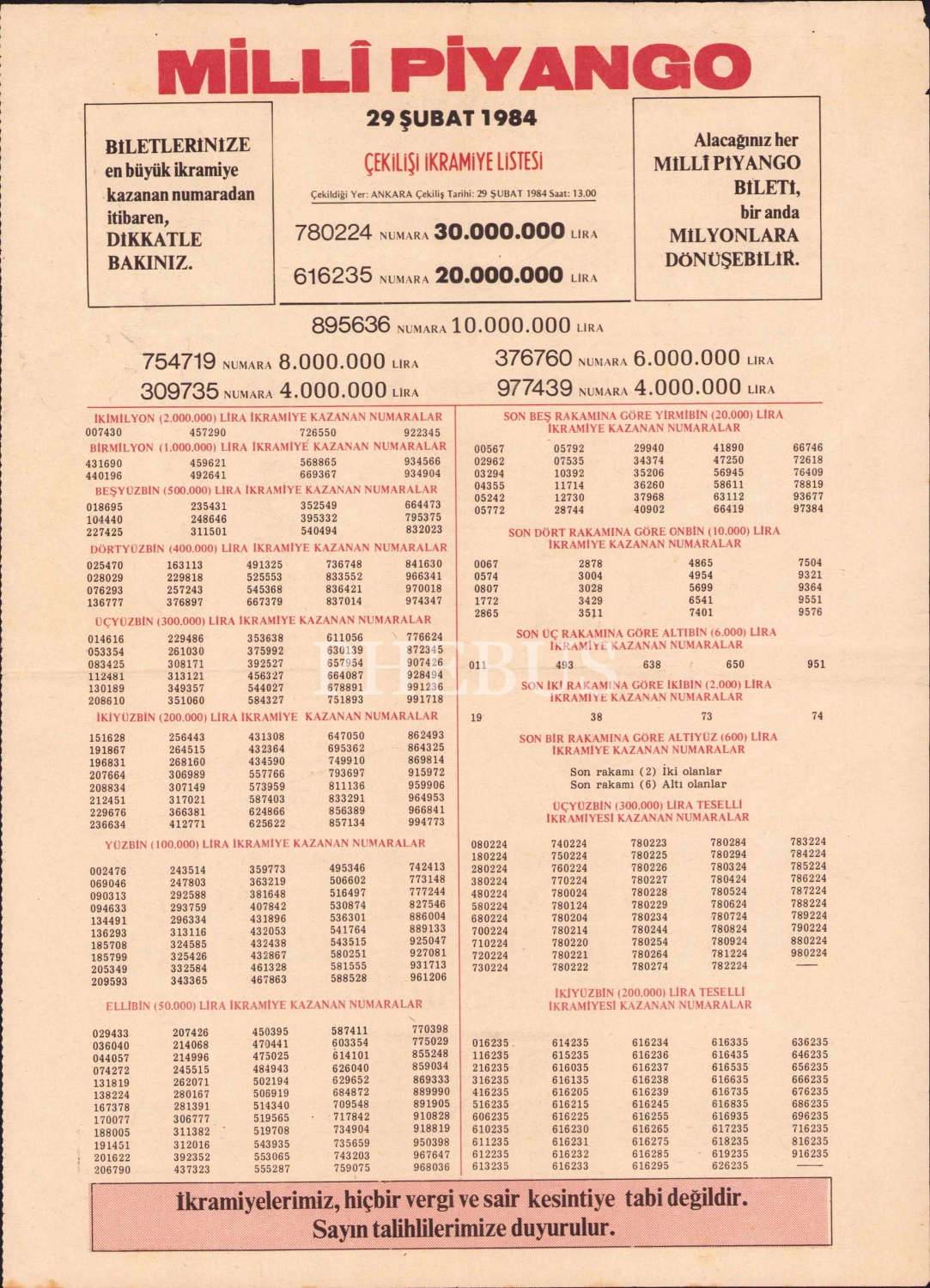 29 Şubat 1984 Milli Piyango çekiliş ikramiye listesi, 25x34 cm