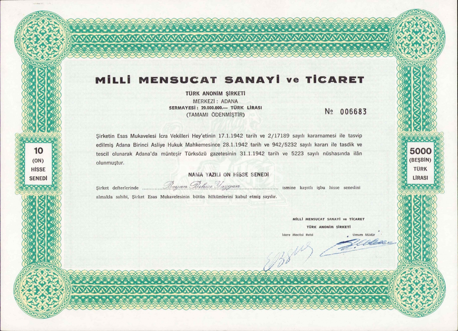 Milli Mensucat Sanayi ve Ticaret Türk Anonim Şirketi hisse senedi, 30x22 cm