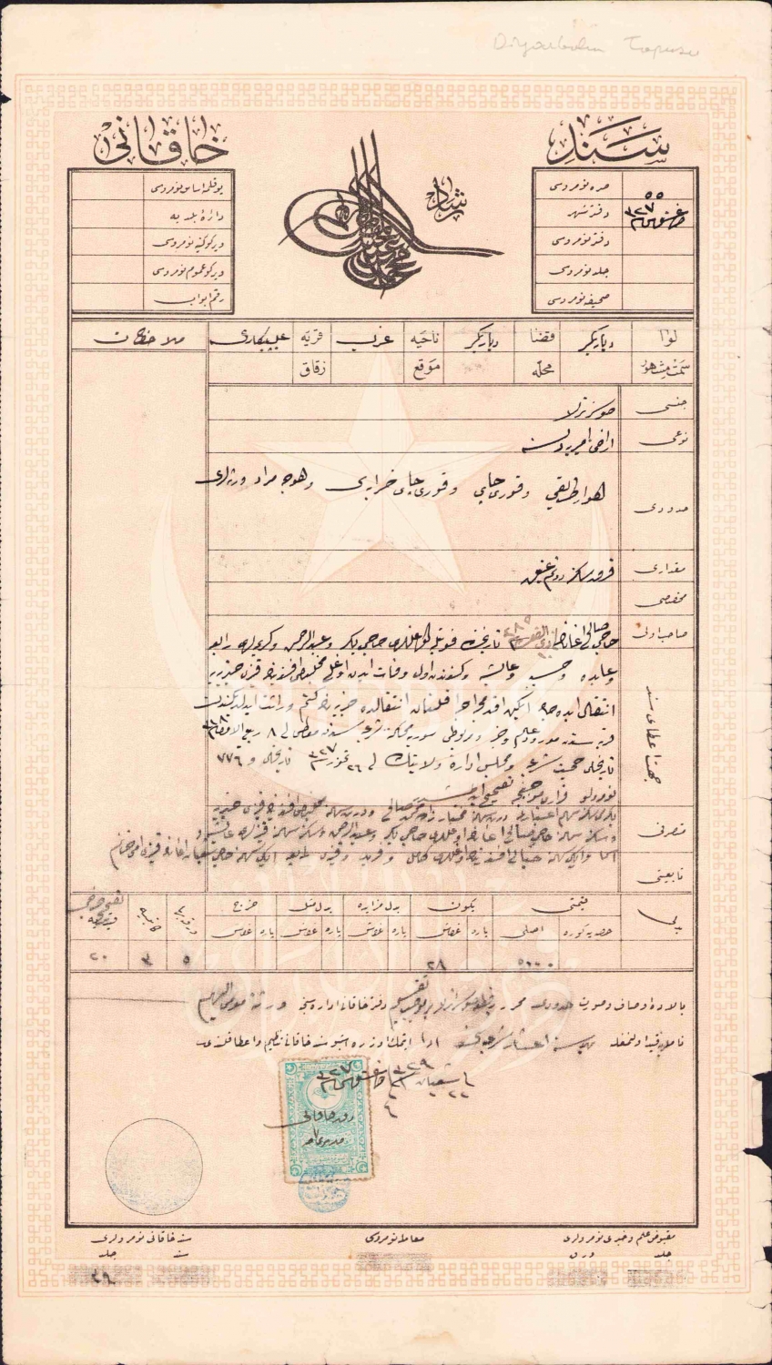 Osmanlıca tapu, Diyarbakır, 1329 tarihli, 22x40 cm