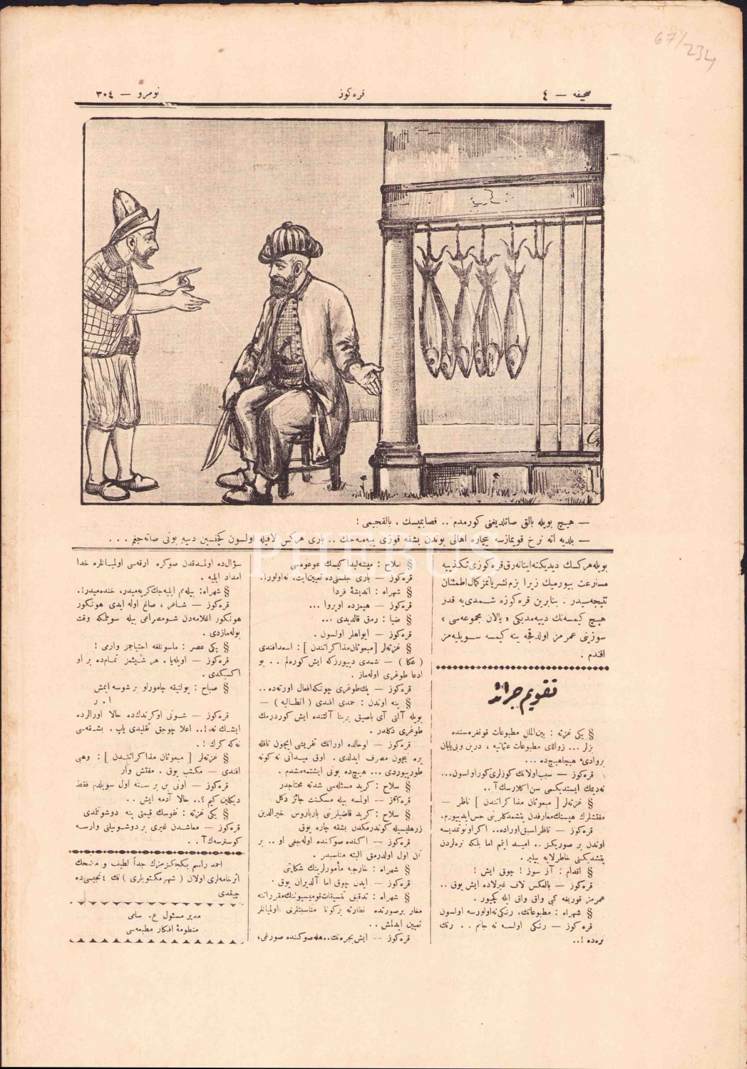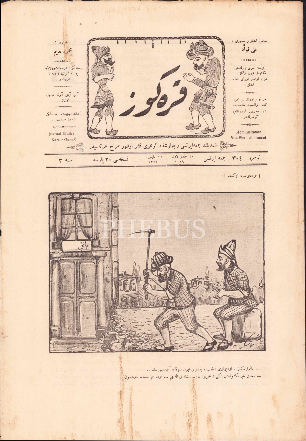 Osmanlıca Karagöz mizah gazetesi, muharriri Mahmud Nedim, 1327, "Canım Karagöz.. O Duvarı Delipte Neden Paraları Sokağa Akıtacaksın..", 4 sayfa, 27x40 cm