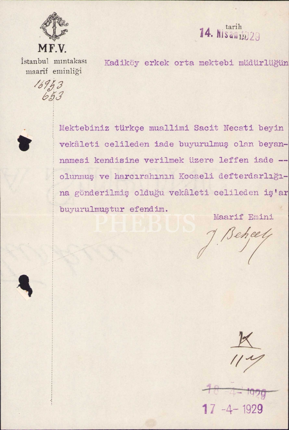 MF. V. İstanbul Mıntıkasu Maarif Eminliği antetli 1929 tarihli doküman, 17x27 cm