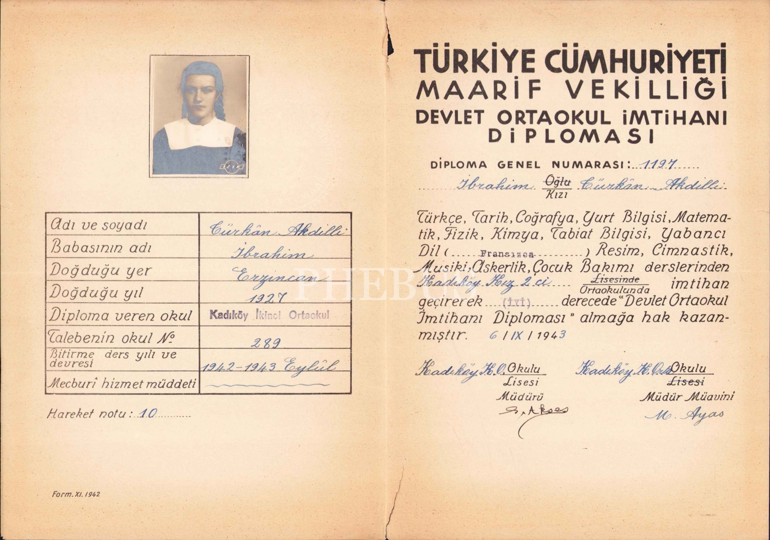 T.C. Milli Eğitim Bakanlığı Devlet Orta Okul İmtihan Diploması, Kadıköy Kız Ortaokulu, 1943, kenarları yırtık 30x20 cm