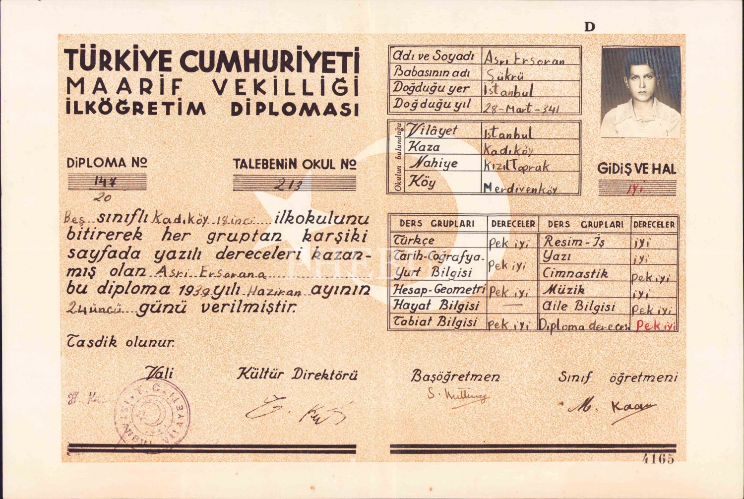 T.C. Milli Eğitim Bakanlığı İlkokul Diploması, Kadıköy18 inci İlkokulu, 1939 tarihli, 32x22 cm
