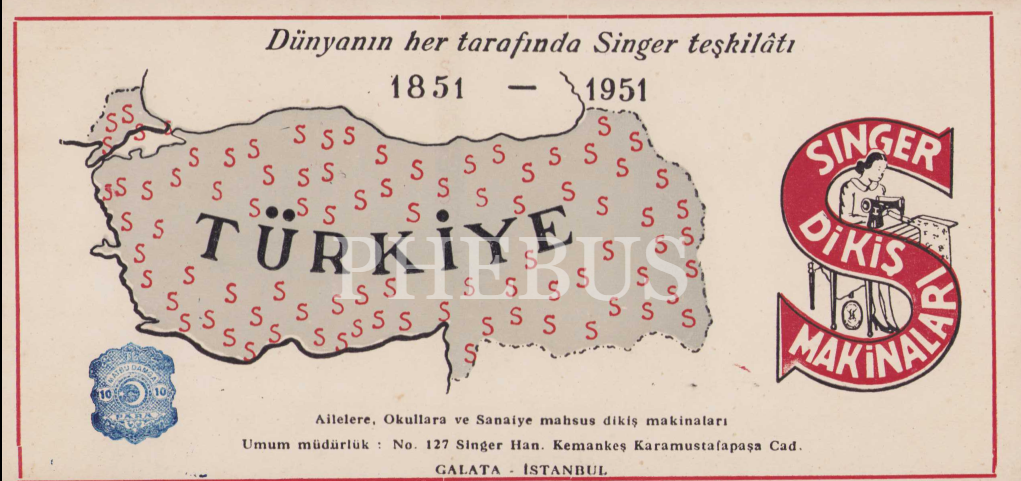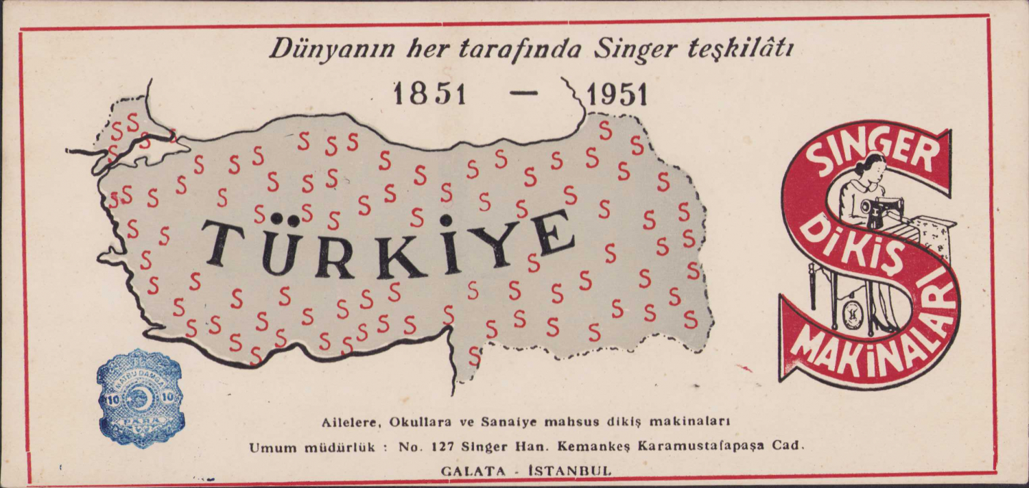 Singer Dikiş Makinaları kurutma kartonu, 1951 tarihli, Galata-İstanbul adresli, 22x10cm