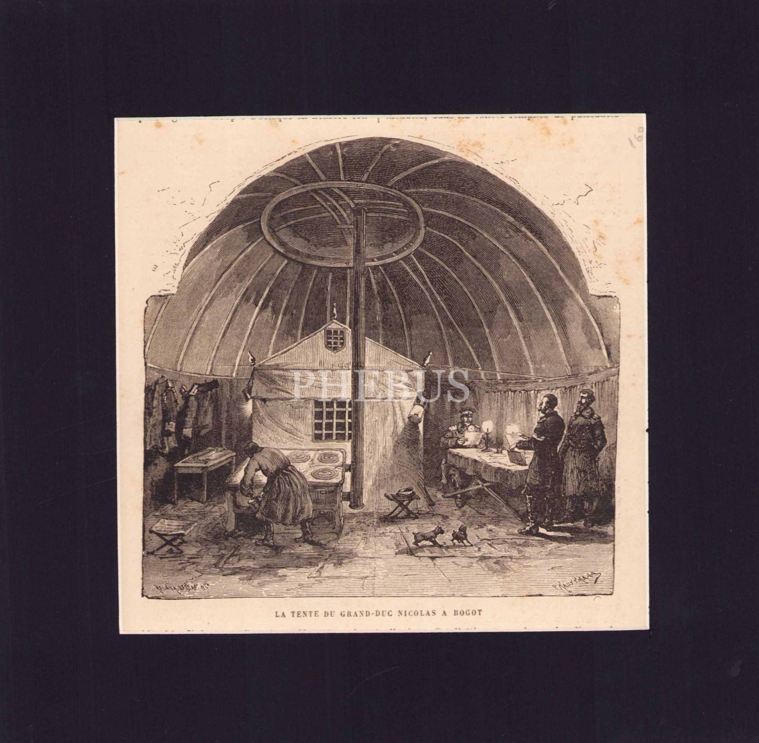 Türk Rus Savaşı gravür, 1877, Büyük Dük Nicolas'ın bataklıktaki çadırı, dergiden kesilmiş, 16x16 cm