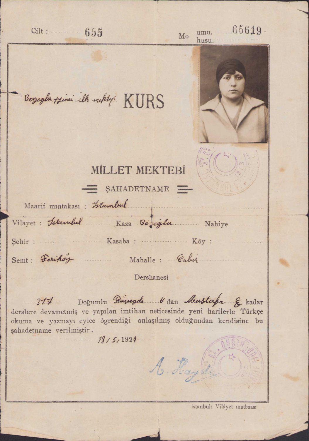 Millet Mektebi Şahadetnamesi, Beyoğlu 11'inci İlk Mektep Kursu, yeni harflerle Türkçe okuma ve yazmayı öğrendiğine dair verilmiş, 1929 tarihli, fotoğraflı, 18x25cm