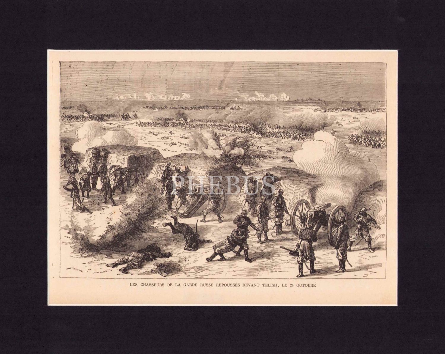 Türk Rus Savaşı gravür, 1877, Rus Muhafız avcıları 24 Ekim'de Telish'in önünde geri çekildi, dergiden kesilmiş, 24x17 cm
