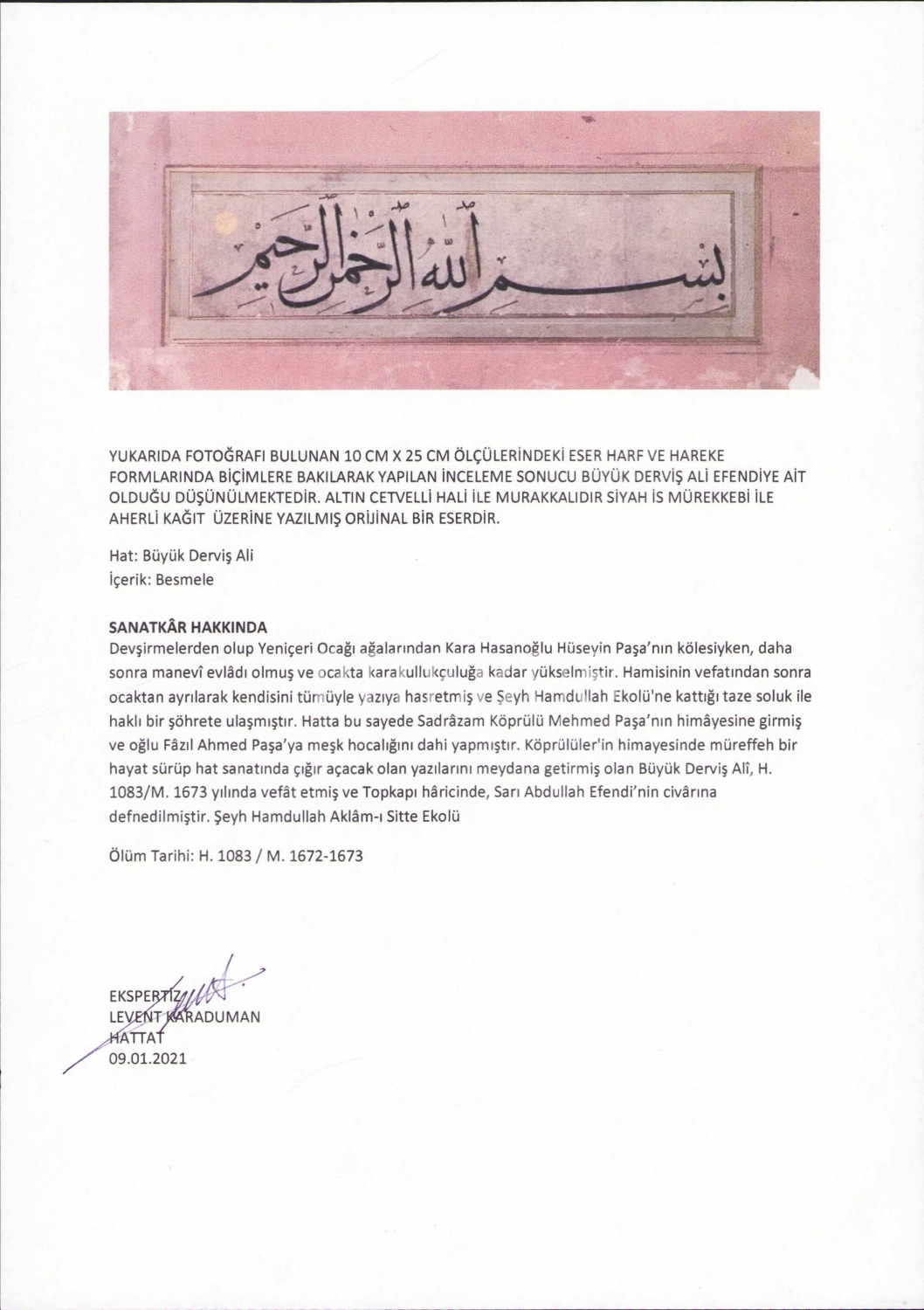 *Tespit, Hattat ve ekspertiz Levent Karaduman'a aittir. Hattat Büyük Derviş Ali, İstanbul'da doğmuştur. Kendisiyle aynı isme sahip diğer hattatlardan ayırt edilmek için “Büyük", “Birinci” veya “Mâruf” lakaplarıyla anılmıştır. Yeniçeri ağası Kara Hasan oğlu Hüseyin Ağa’nın manevi evladı veya kölesi olup onun yanında yetişmiş, gençliğinde karakullukçuluk vazifesinde de bulunmuştur. Aklam-ı sitteyi Halid Erzurumi’den öğrenmiş ve Şükrullah Halife, Pir Mehmed b. Şükrullah, Hasan Üsküdari, Halid Erzurumi silsilesiyle kendisine kadar gelen Şeyh Hamdullah üslubunu unutulmak üzere iken yeniden ihya etmiştir. Bu sebeple Derviş Ali’ye “şeyh-i sani” veya “vazıu’l-aslı’s-sanî” unvanları da verilmiştir. Aralık 1673'de vefat etti. Topkapı Mezarlığı’na defnedilmiştir. Ağakapılı İsmail ve Suyolcuzade Mustafa Efendi meşhur talebeleri arasındadır. Derviş Ali, Hafız Osman’ın da ilk hocası olup yaşlılığı sebebiyle bu kabiliyetli gençle gerektiği gibi meşgul olamayınca onu Suyolcuzade’ye göndermiştir.