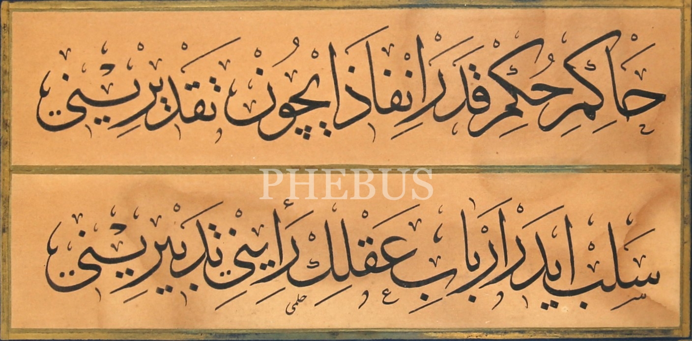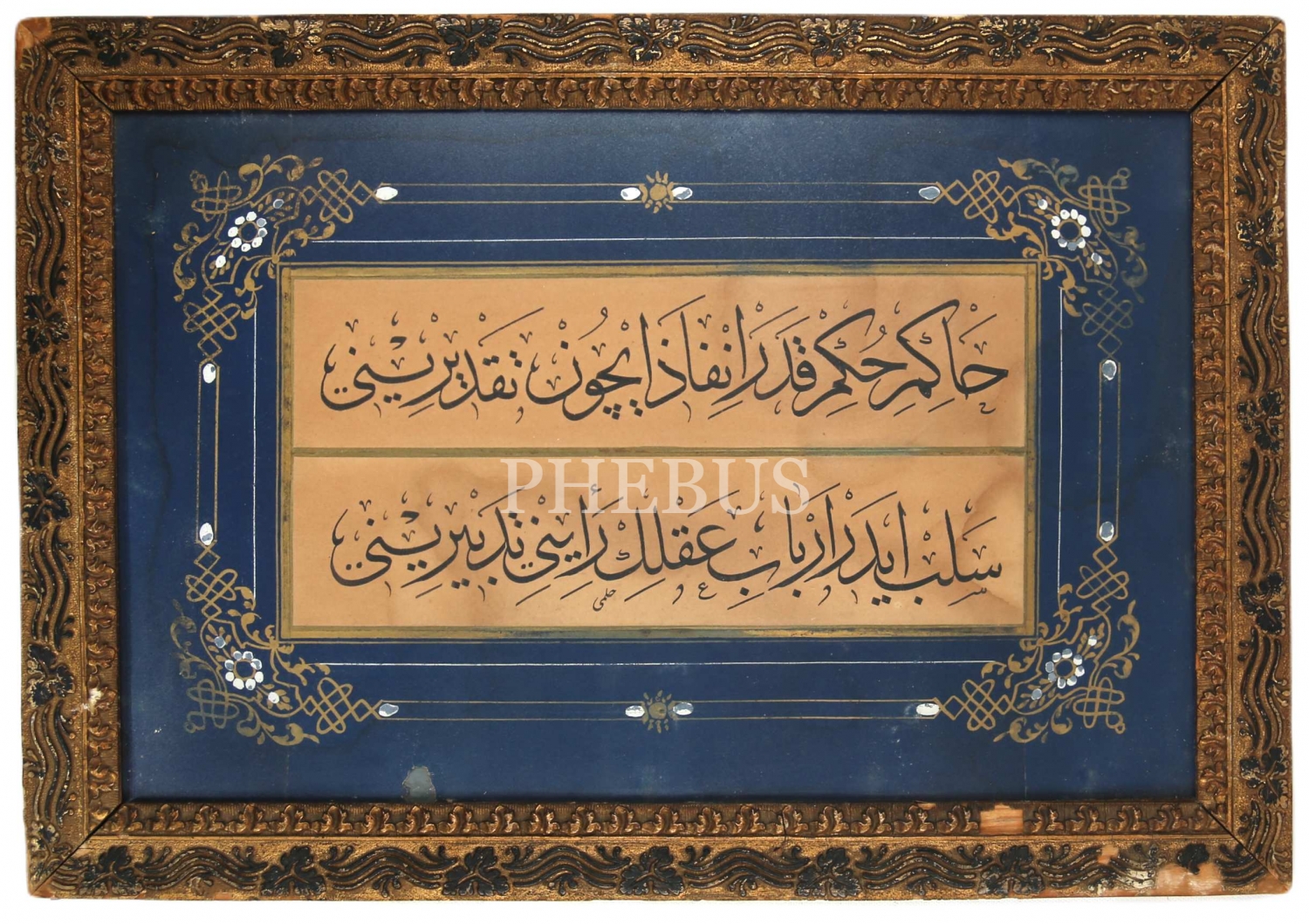 Celi Sülüs Levha, "Hakim hükm-i kaderi infaz için takdirini/ Erbab-ı aklın re'yini tedbirini", Hilmi Efendi ketebeli, dönem tezhipli, kendi çerçevesinde, 26x13 cm