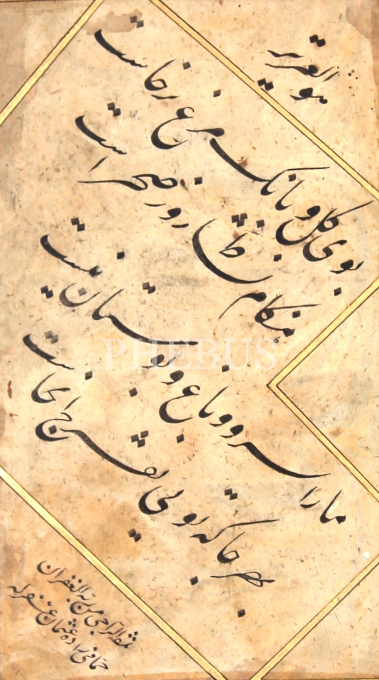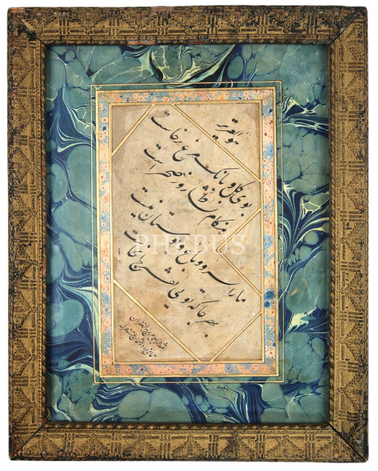 Talik mail kıta, Hammamizade Osman Efendi ketebeli, altın cetvelli ve ebru pervazlı, çerçeveli, 13x21 cm