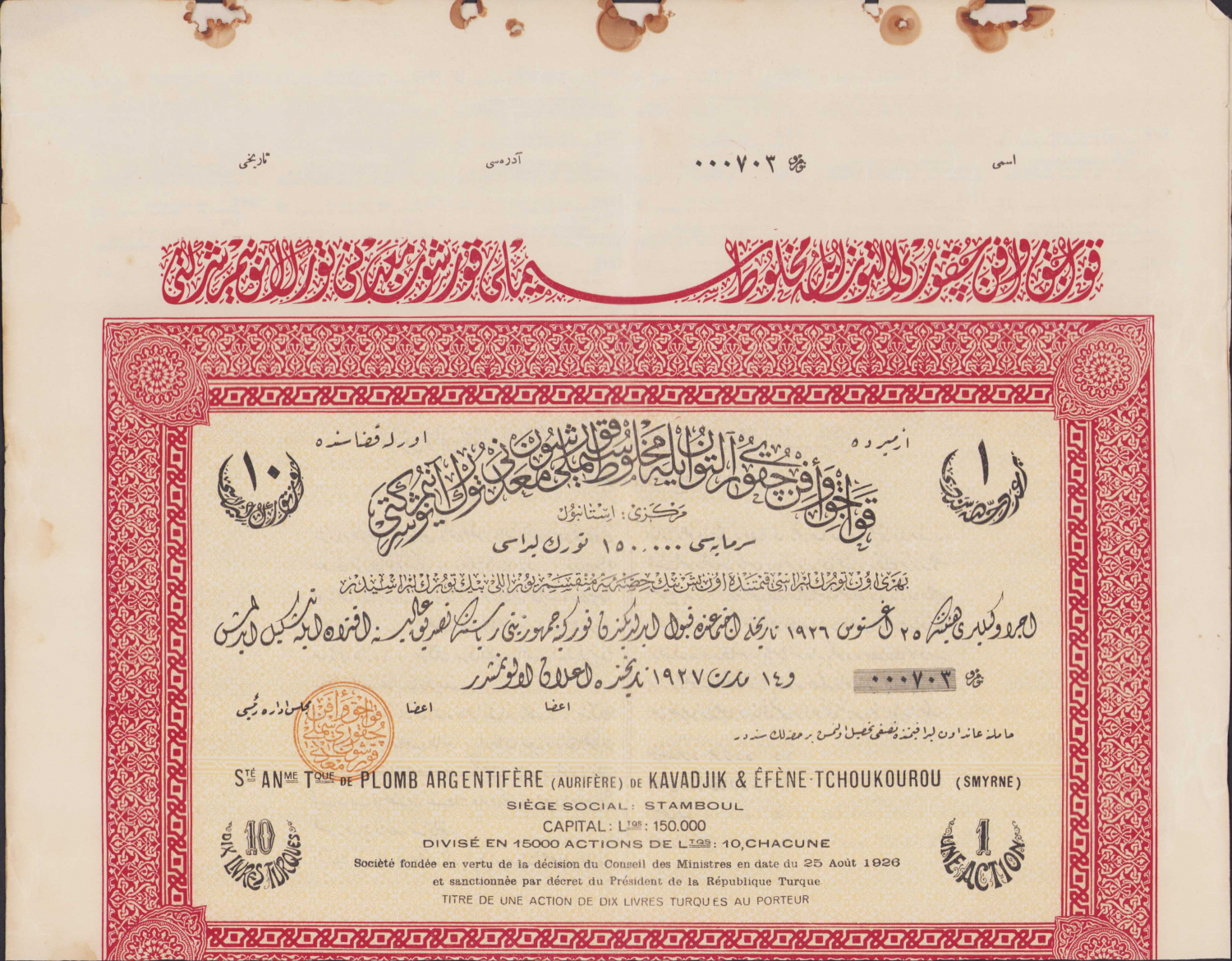 Osmanlı İzmir Kavacık - Efene Kurşunlu altın madenleri onluk hisse senedi, 1926 tarihli, 49x31cm