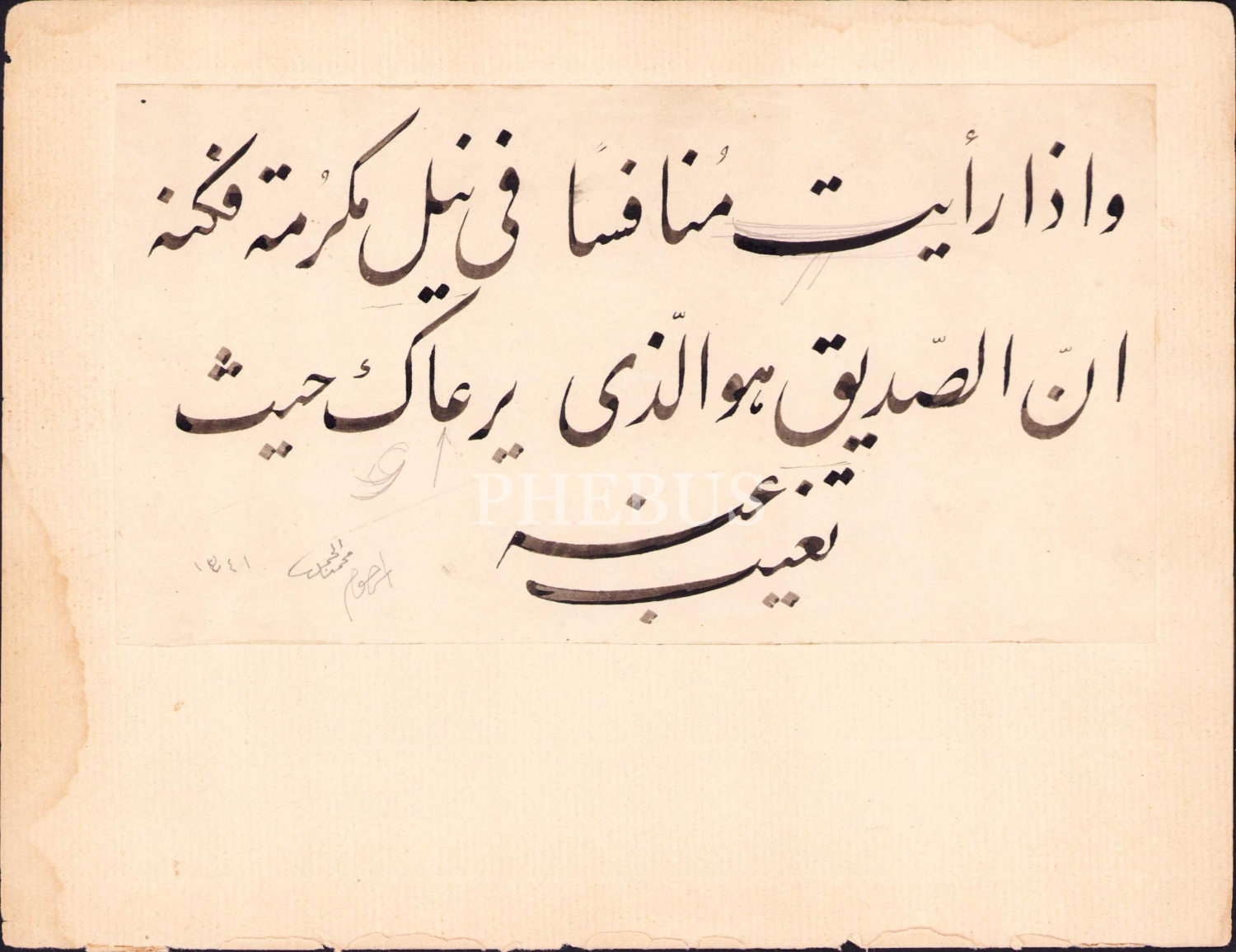 Talik yazı, sol altta kurşun kalemle "Merhum Muhammed El-Cemel-1341" yazılı, 19x10 cm