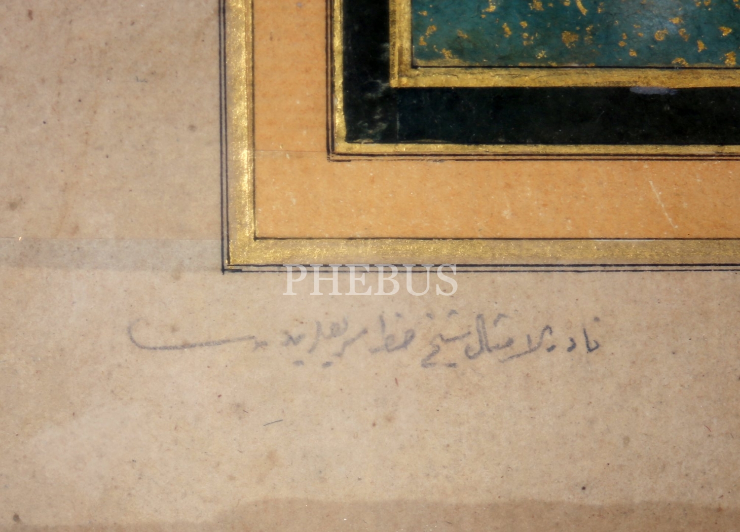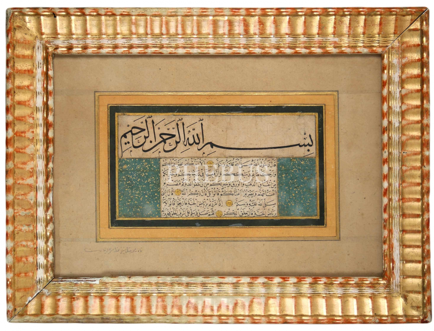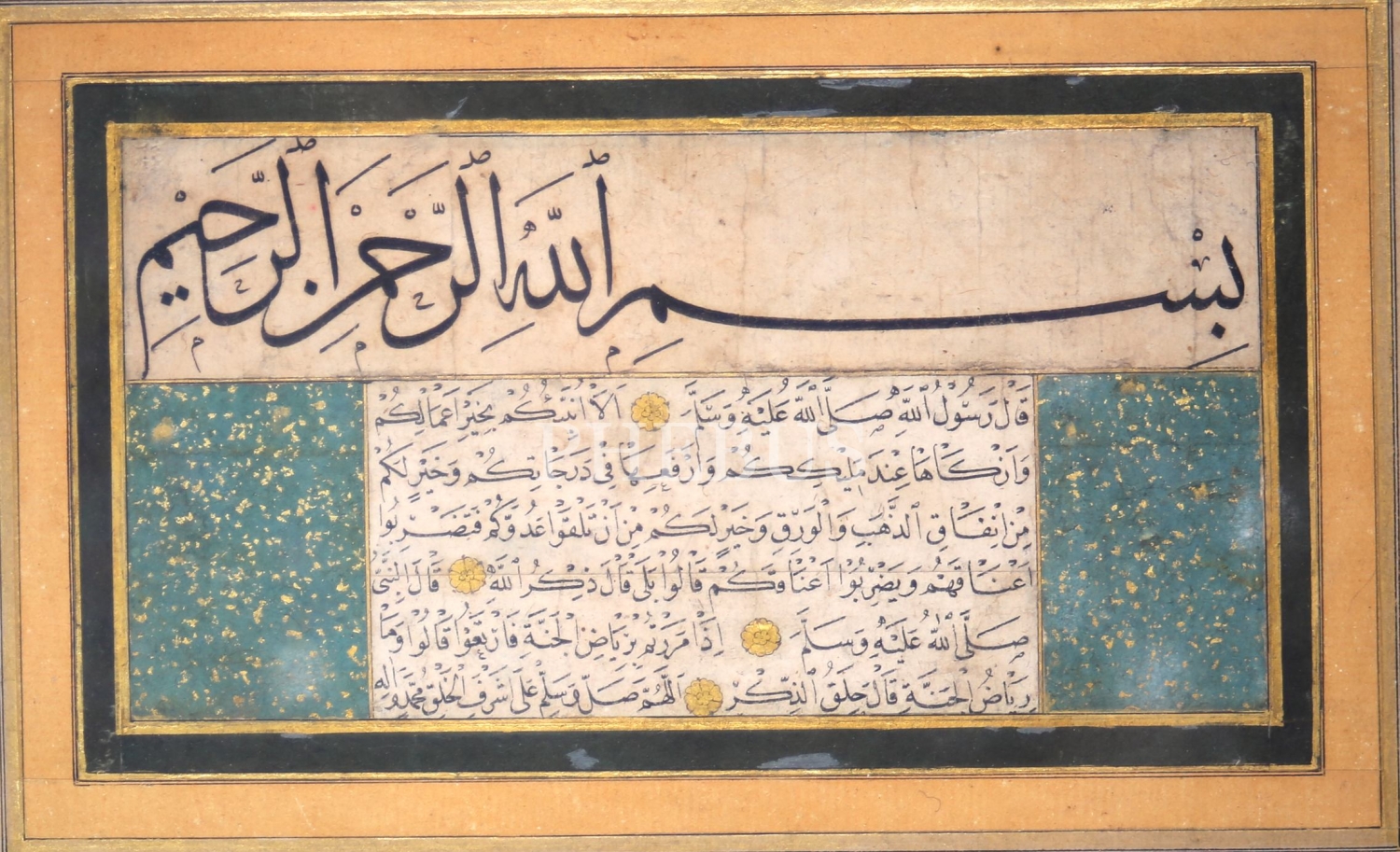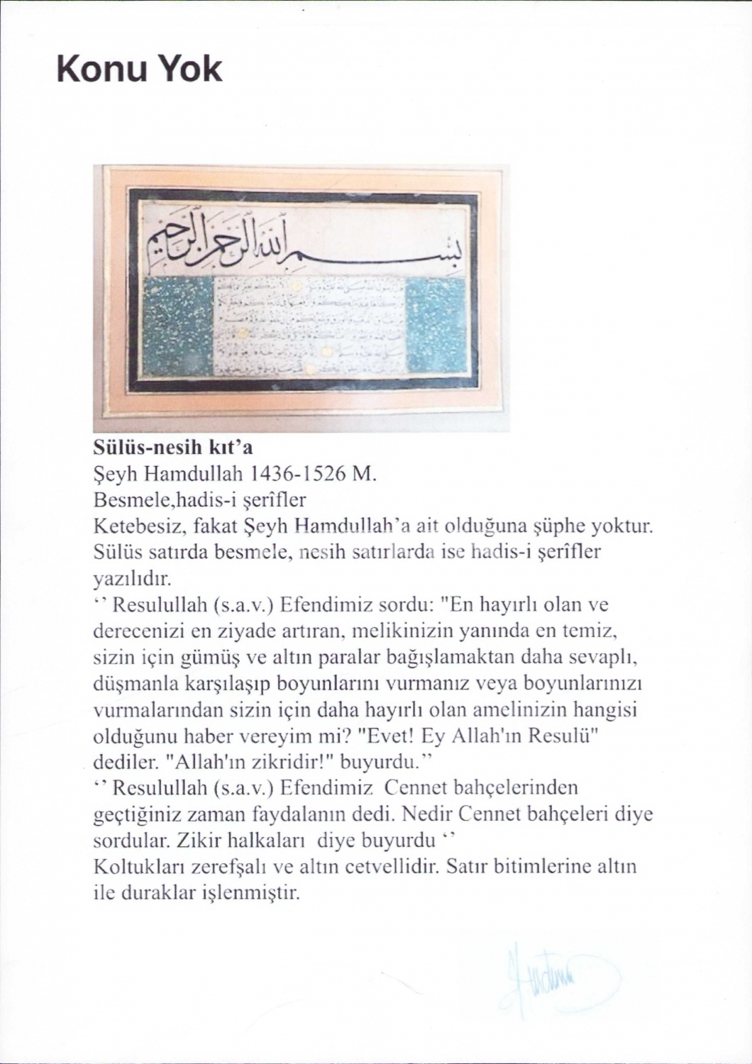 Erken Dönem Sülüs Nesih Kıta, Besmele ve Hadis-i Şerif, sol altında Osmanlıca "Nadirü'l emsal Şeyh Hatt-ı Şerifleridir" yazılı, Hattat Hüseyin Gündüz'ün hattın Şeyh Hamdullah'a ait olduğu tespiti mevcut, 18x10 cm Düzenle