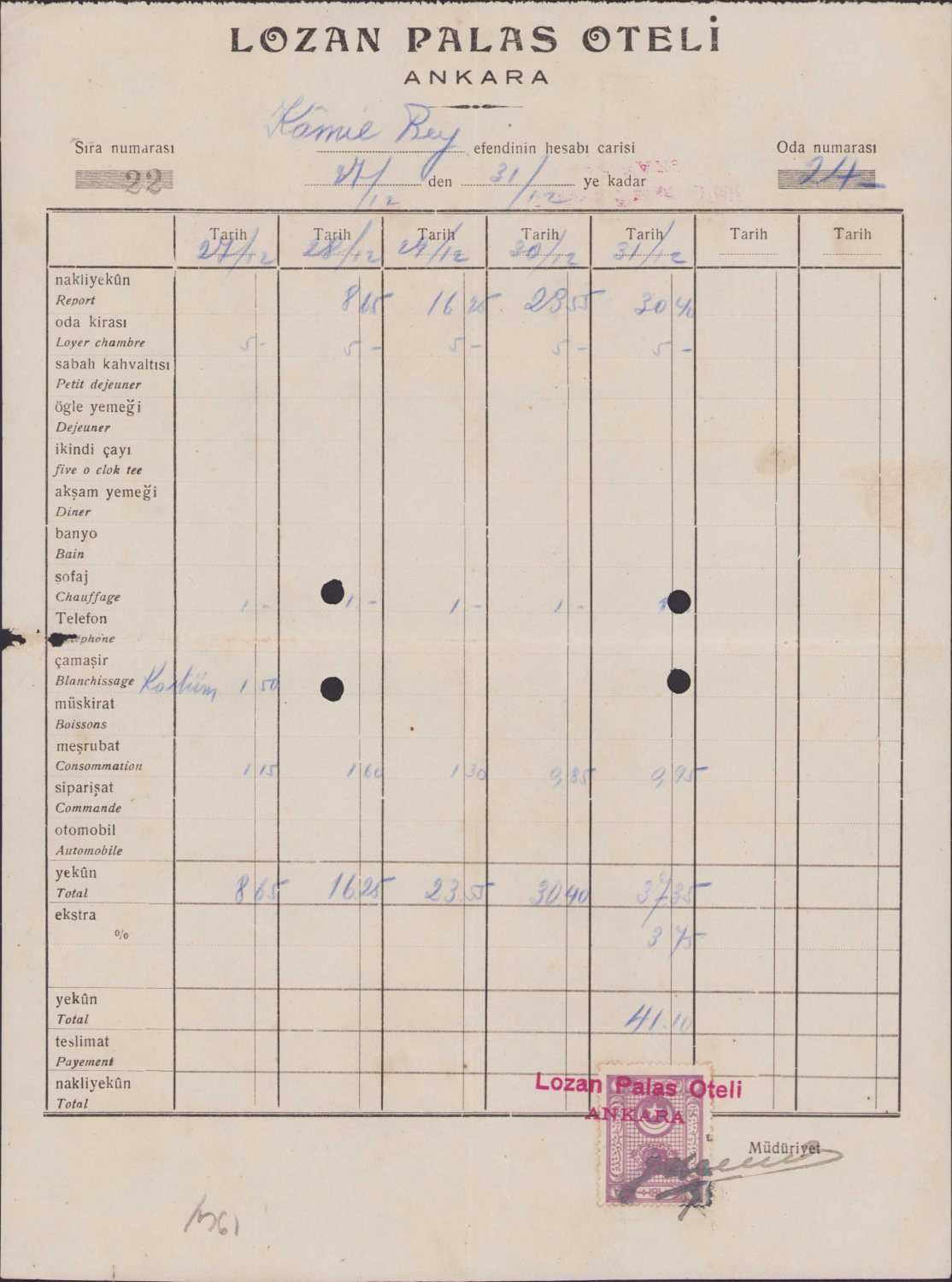 Lozan Palas Oteli Ankara antetli fatura, Fransızca-Türkçe yazılı, Osmanlı pullu, 1930'lar