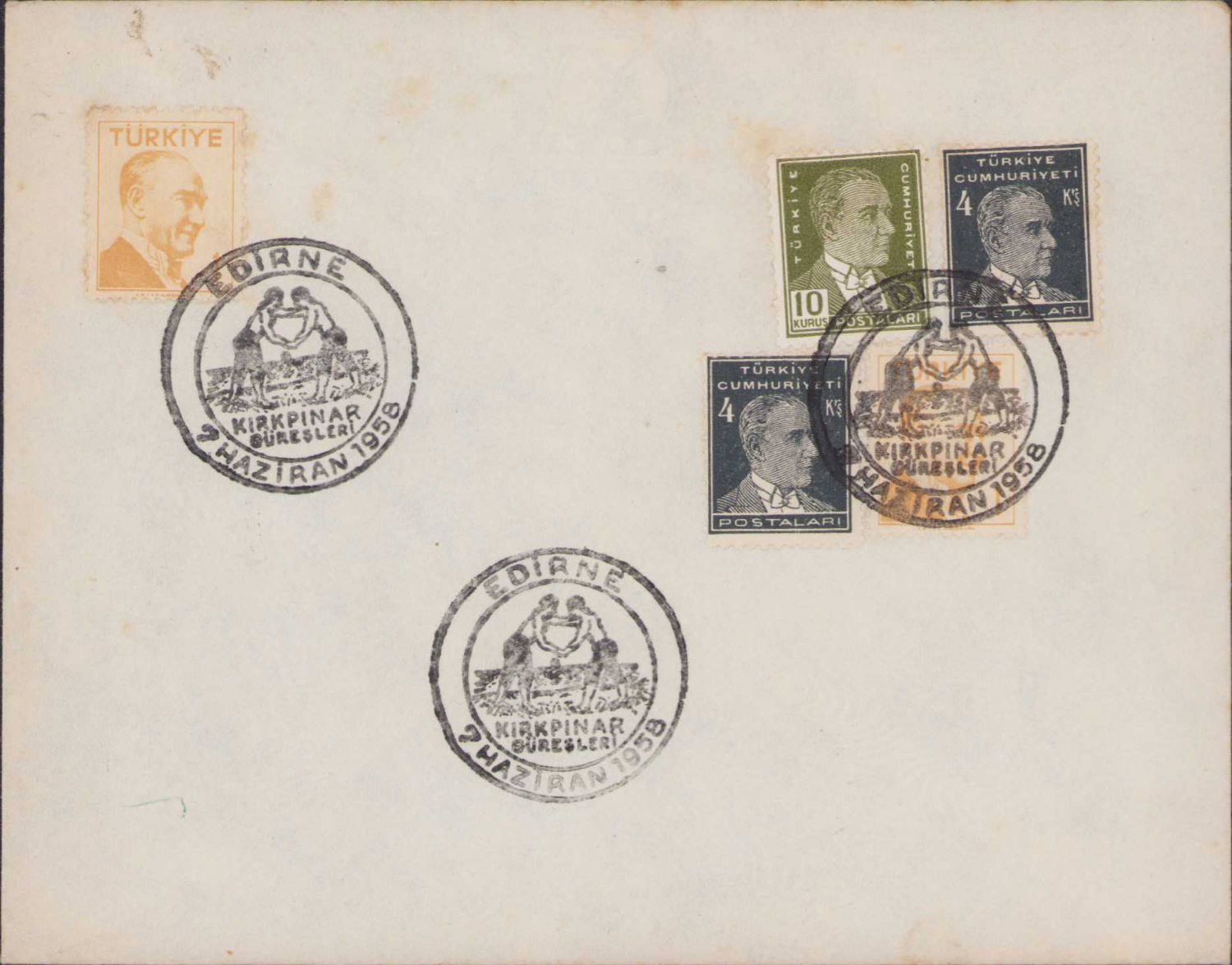 Edirne Kırkpınar Güreşleri 2 Haziran 1958 tarihli ilkgün zarfı, damgalı, Atatürk pullu, 16x12cm