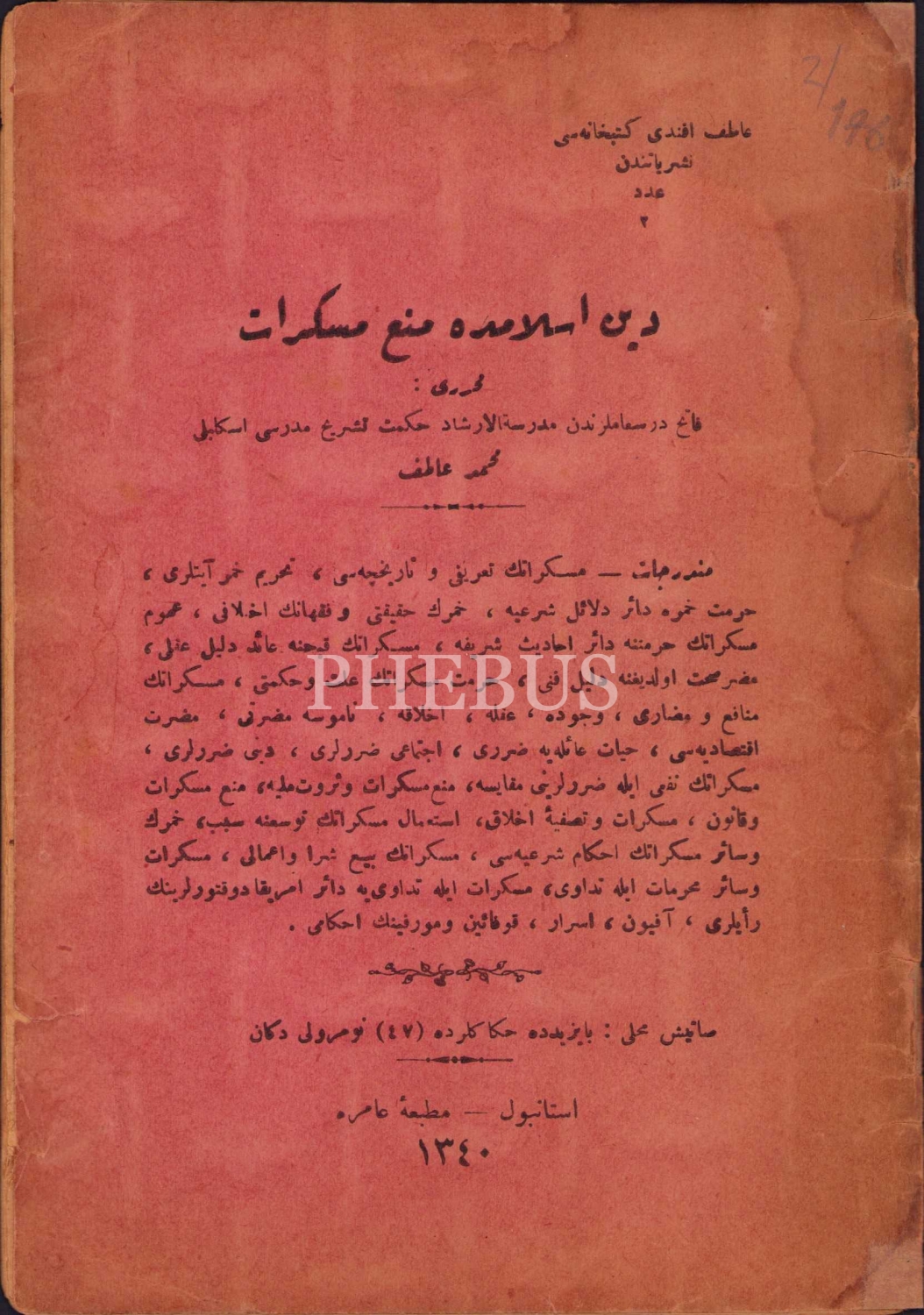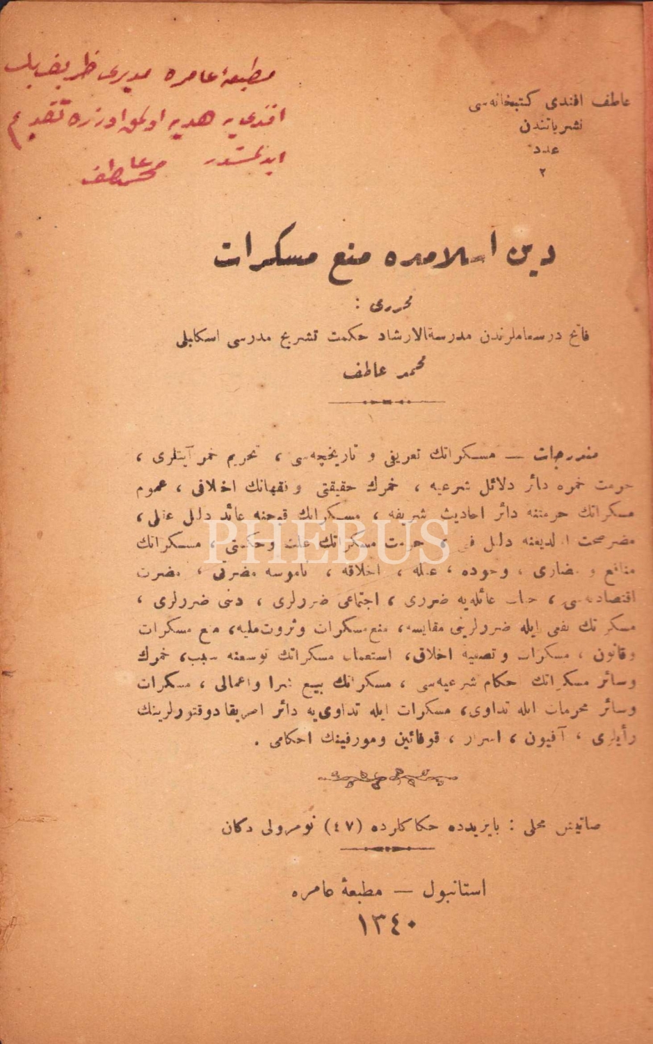 Din-i İslam'da Men'i Müskirat [İslam Dininde İçki Yasağı], 1926'da İstiklal Mahkemesi Yargılamalarında İdam Edilen İskilipli Atıf Efendi'den Matbaa-i Amire Müdürü Nazif Bey'e imzalı ithaflı, 32 sayfa, Osmanlıca, İstanbul, Matbaa-i Amire, 14x20 cm