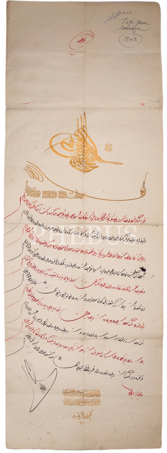 Konya'nın Aksaray nahiyesinde miras hukuku ile ilgili, Sultan Reşad tuğralı, 1333 tarihli, Osmanlıca berat, 29x80 cm