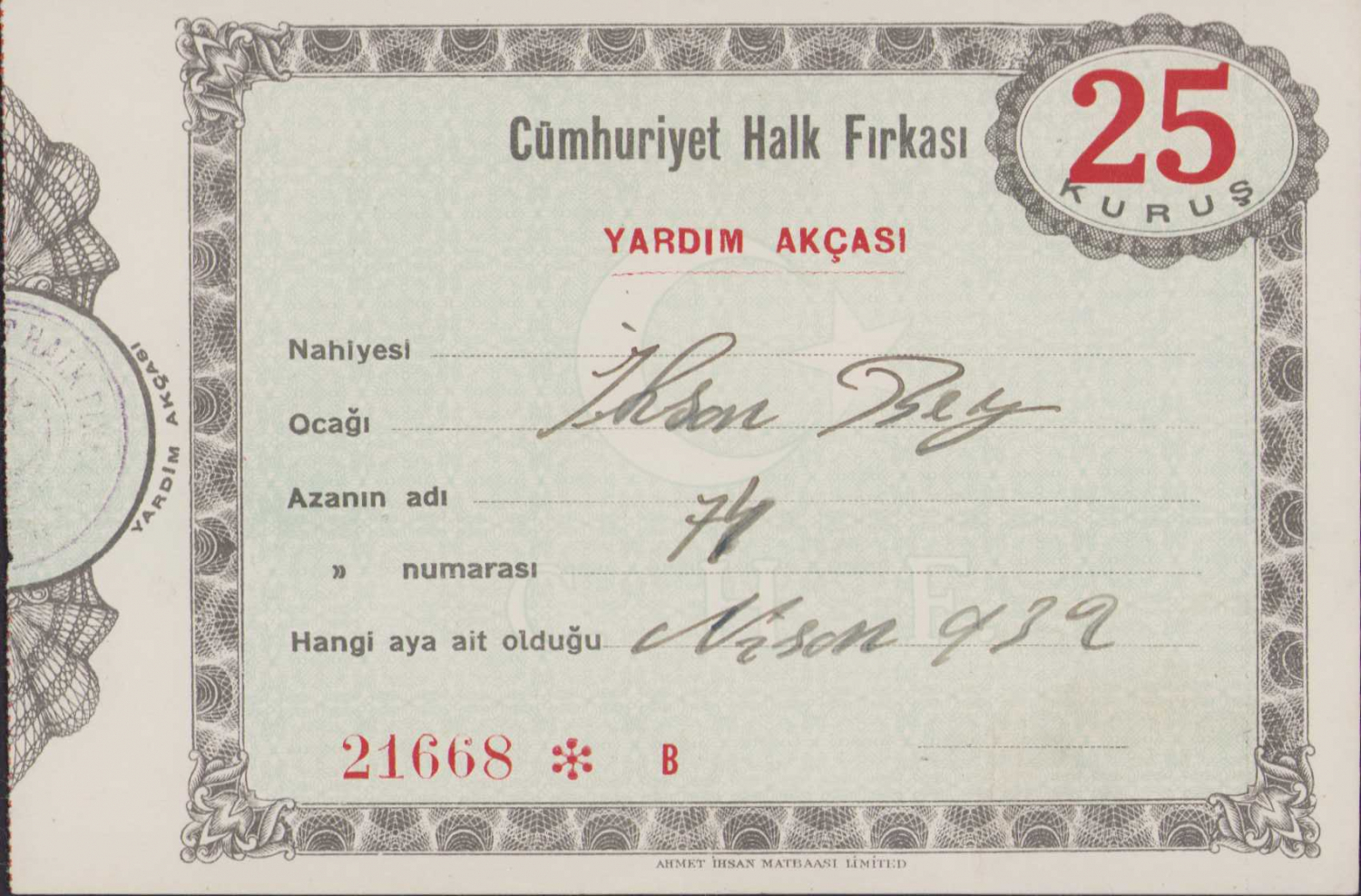 Cümhuriyet Halk Fıkrası Yardım Akçası, 25 kuruş, 1939 tarihli, Ahmet İhsan Matbaası baskısı, 14,5x9,5cm
