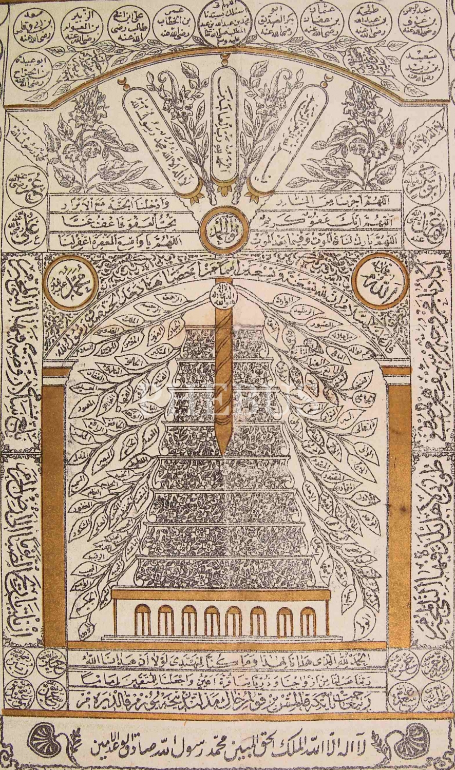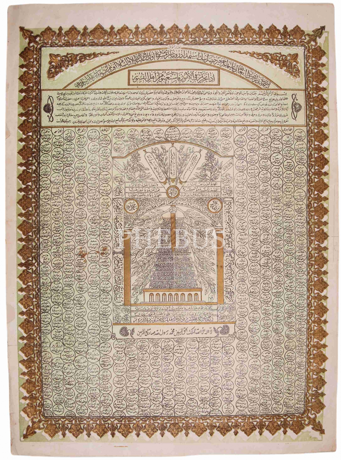 Osmanlı dönemi taş baskı Ashab-ı Bedr'in isimlerinin yazılı olduğu matbu Arapça tevessül şeması, 42x56 cm