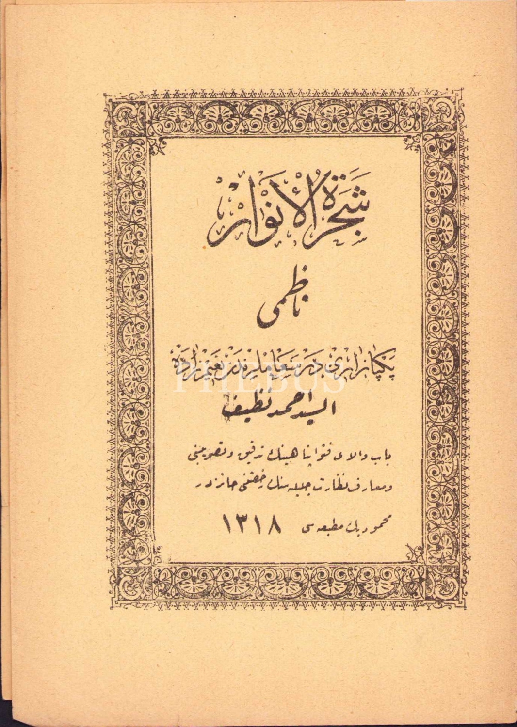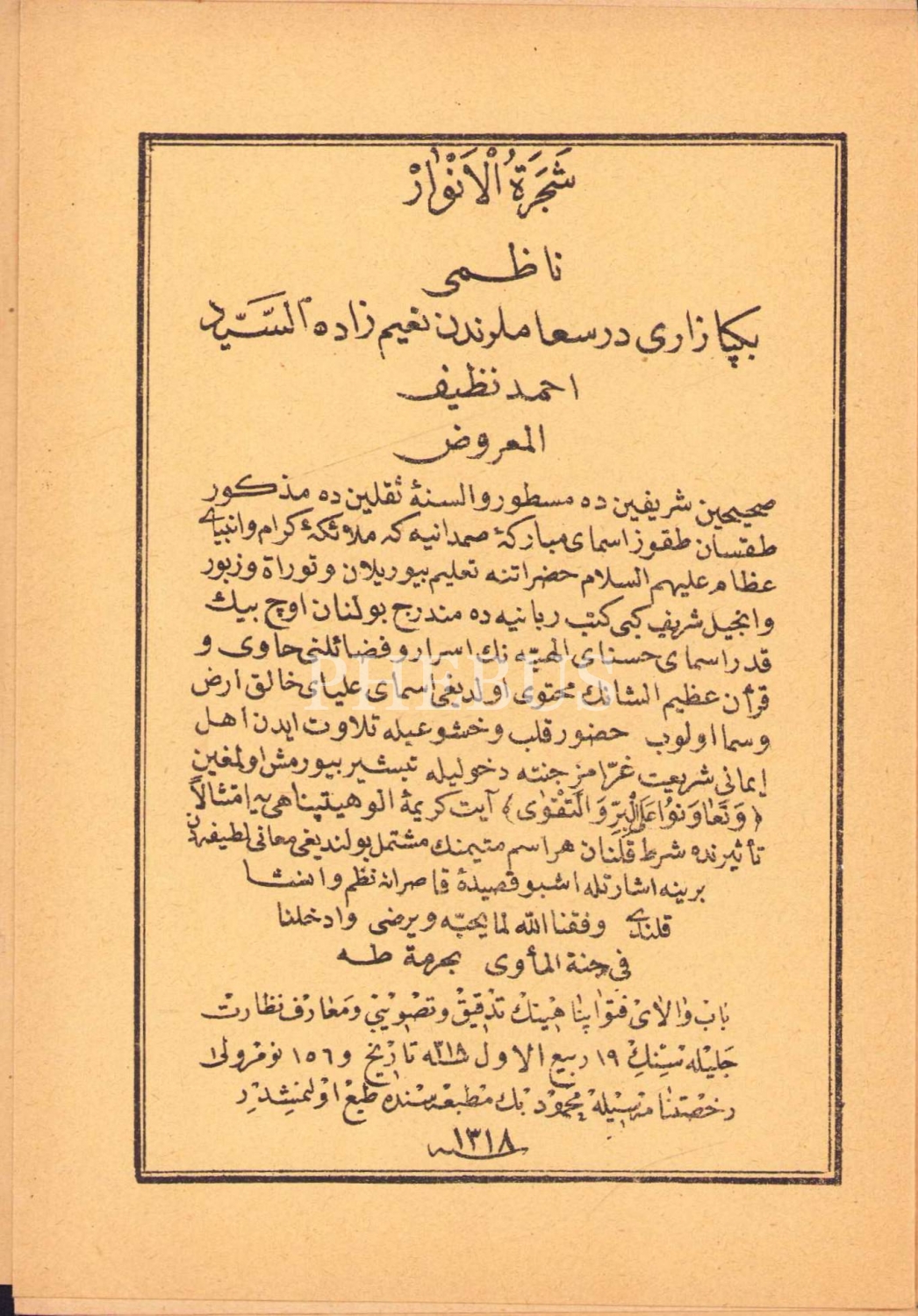 Şeceretü'l Envar, Naimzade Es-Seyyid Ahmed Nazif Efendi, Mahmud Bey Matbaası, 1318 tarihli, 7 sayfa, 12x17 cm