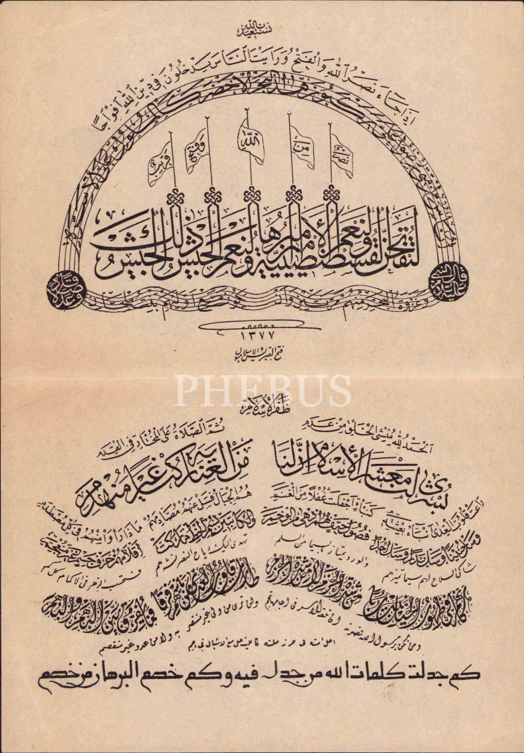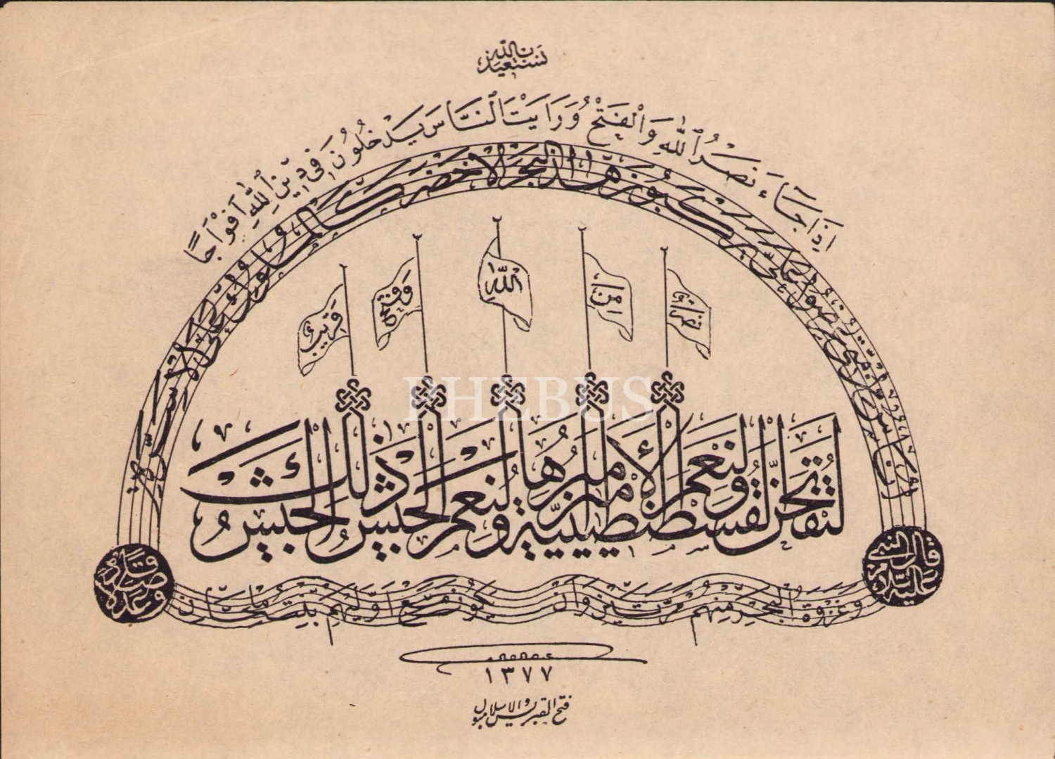 İstanbul'un fethiyle ilgili Hadis-i Şerif, Fetih Suresi'nden ayet-i kerimeler yazılı matbu varaka, 1377 tarihli, 17x25 cm