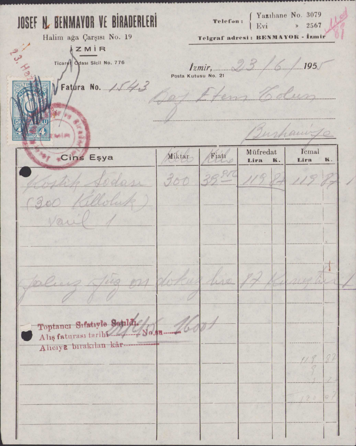 İzmit Yahudi Joseph Benmayor ve Biraderleri antetli fatura, İzmir adresli, 1955 tarihli, pullu, damgalı, Burhaniye adresli, 17,5x22cm