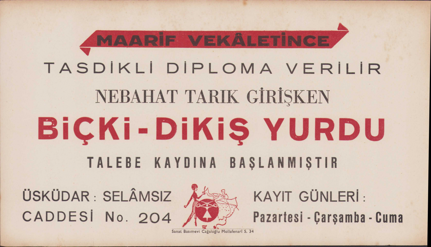 Nebahat Tarık Girişken Biçki-Dikiş Yurdu, talebe kayıt ilanı, karton levha, Üsküdar Selamsız adresli, Sanat Basımevi baskısı, 28,5x16,5cm