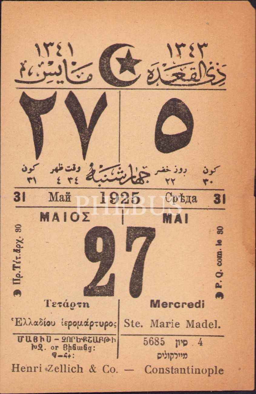 Osmanlıca, Fransızca, Ermenice, İbranice, Rumca beş dilde yazılı 27 Mayıs 1925 tarihli takvim yaprağı, Henri Zellich & Co. - Constantinople, 6x10 cm